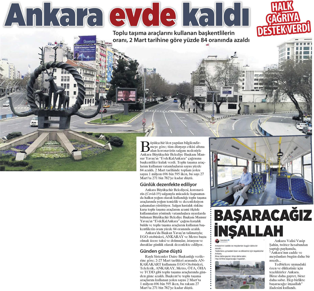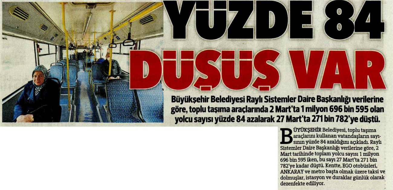 Sabah Ankara / 31.03.2020 Başkent’te toplu taşıma kullanımı yüzde 84 azaldı
