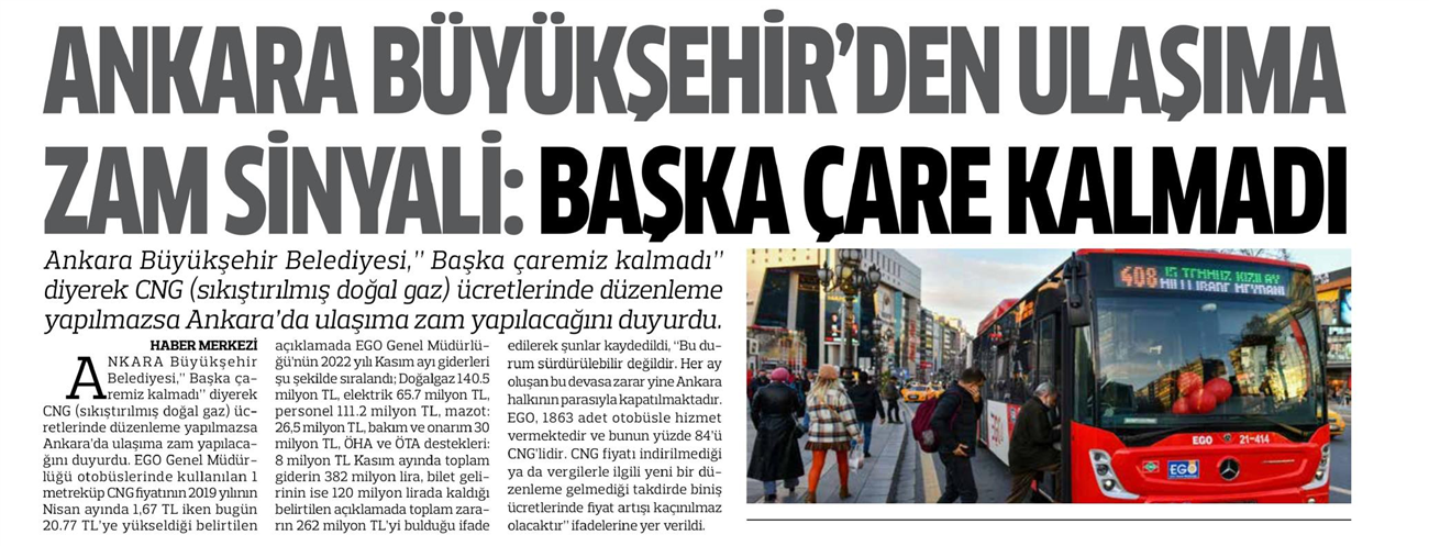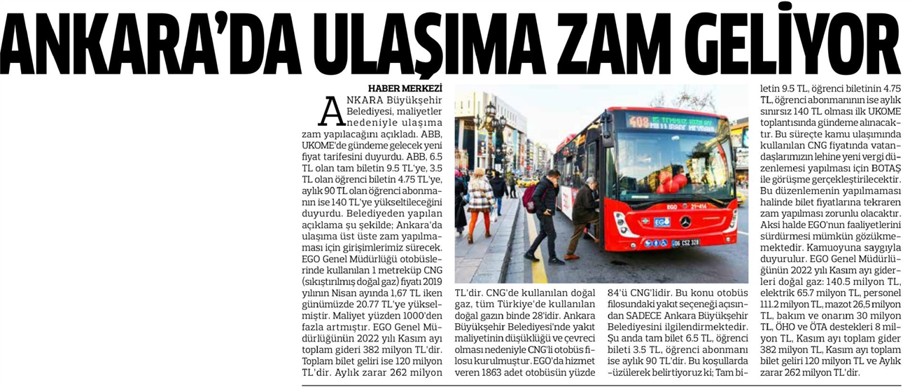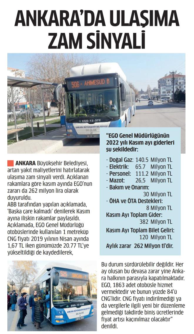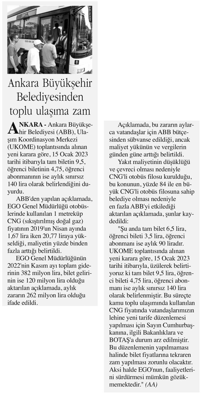 Milli Gazete / 05.01.2023 Ankara'da ulaşıma zam sinyali