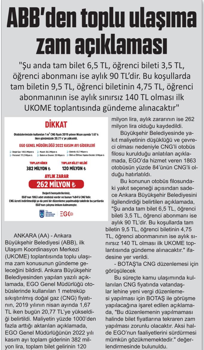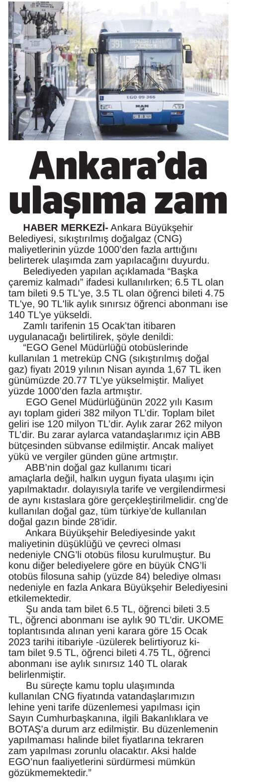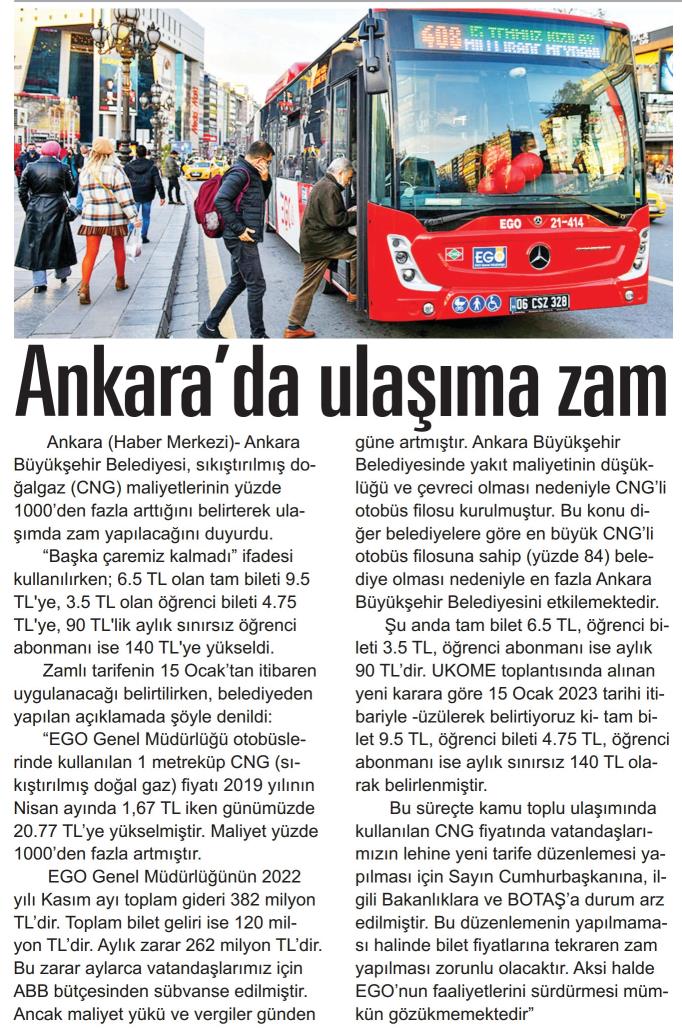 Başkent Gazetesi / 10.01.2023 Ankara'da ulaşıma zam