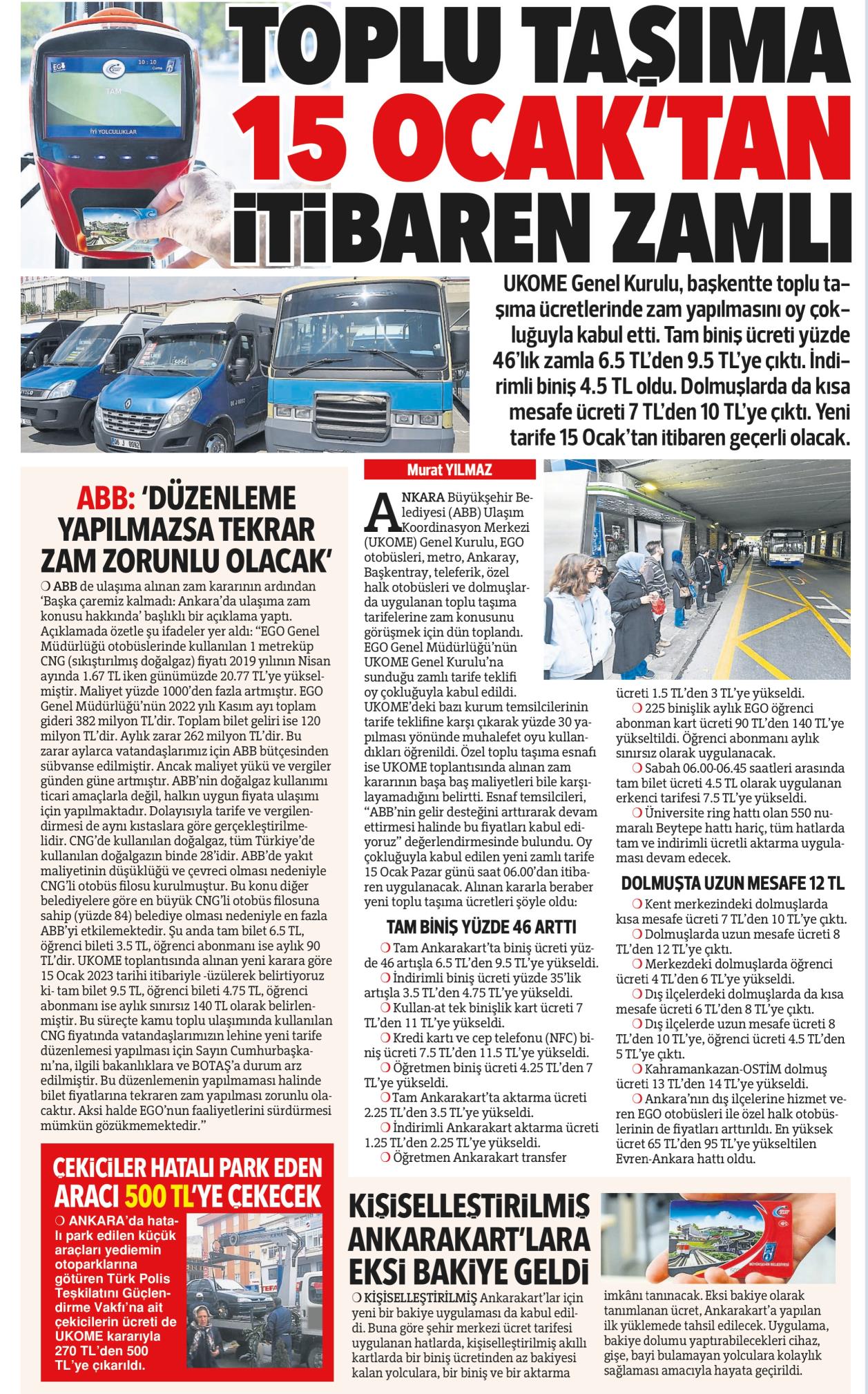 Hürriyet Ankara / 10.01.2023 15 Ocak'ta ulaşıma yeni tarife