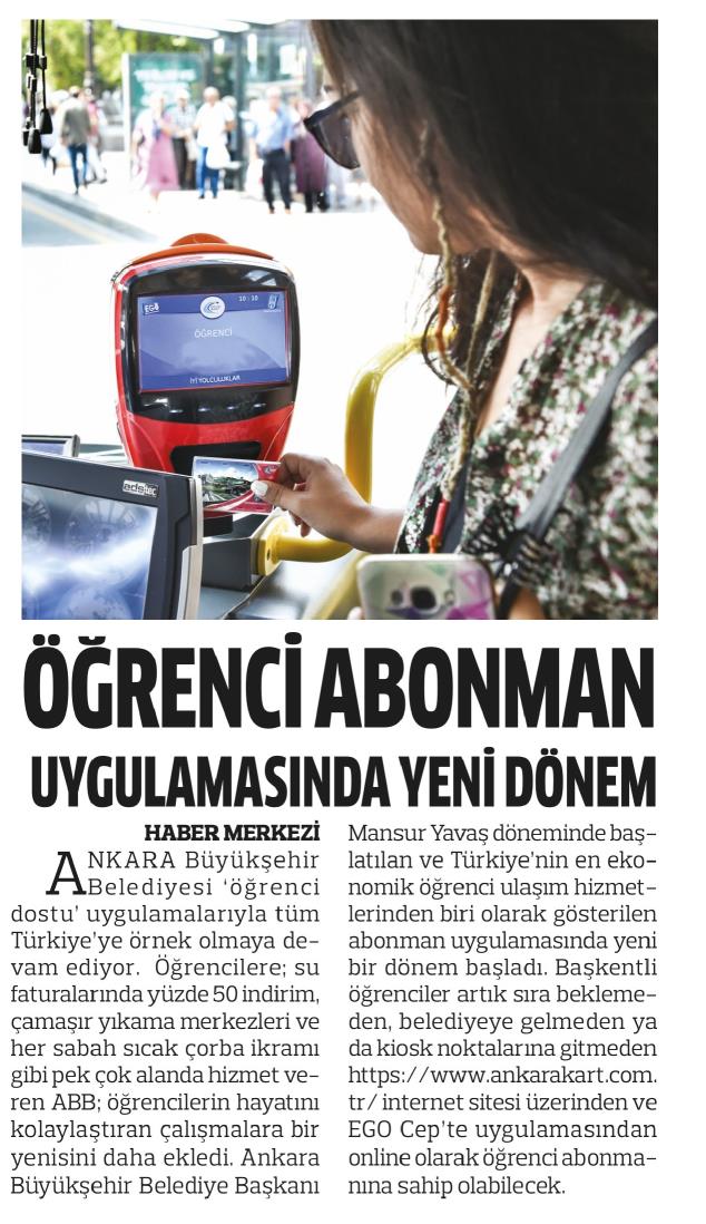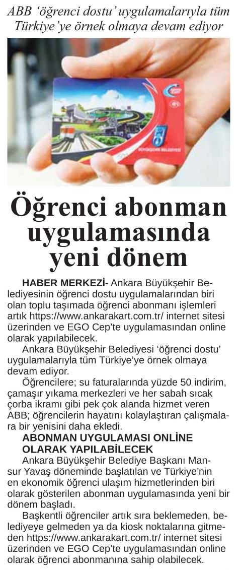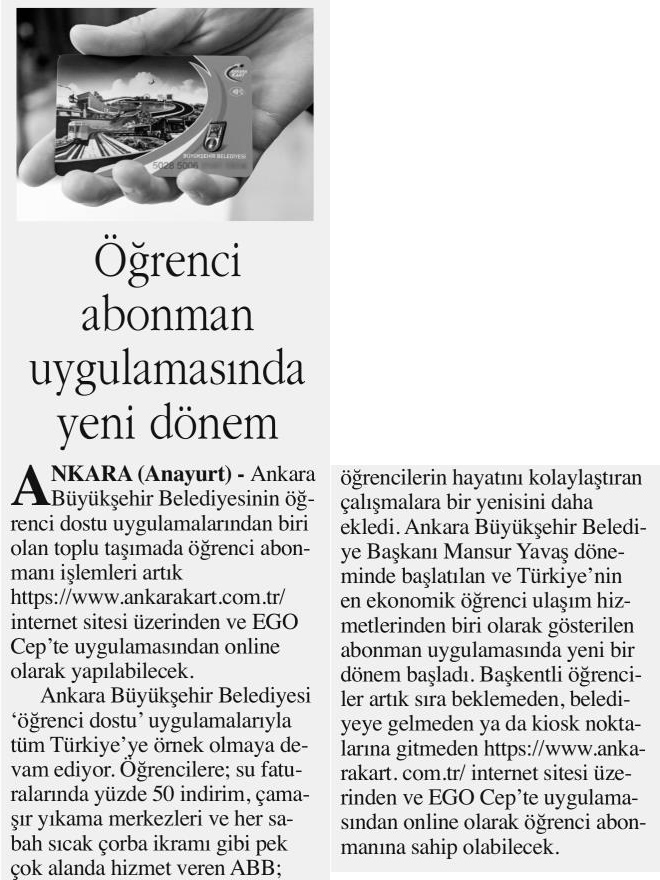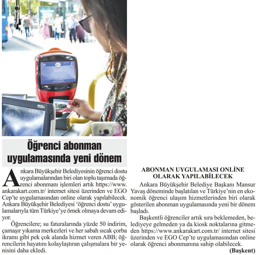 Başkent Gazetesi / 02.01.2023 Öğrenci abonman uygulamasında yeni dönem
