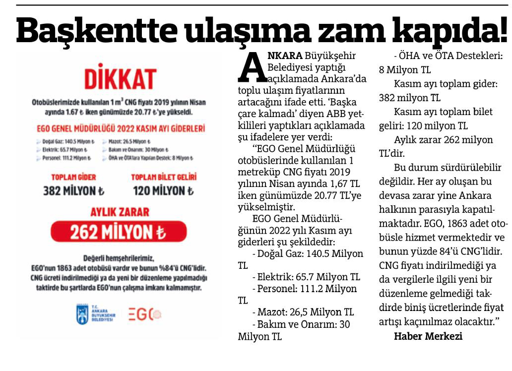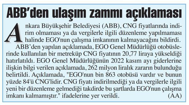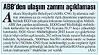 Başkent Gazetesi / 04.01.2023 ABB'den ulaşım zammı açıklaması