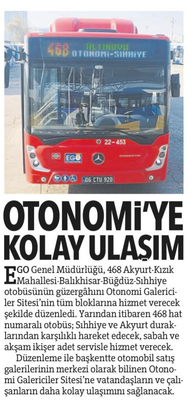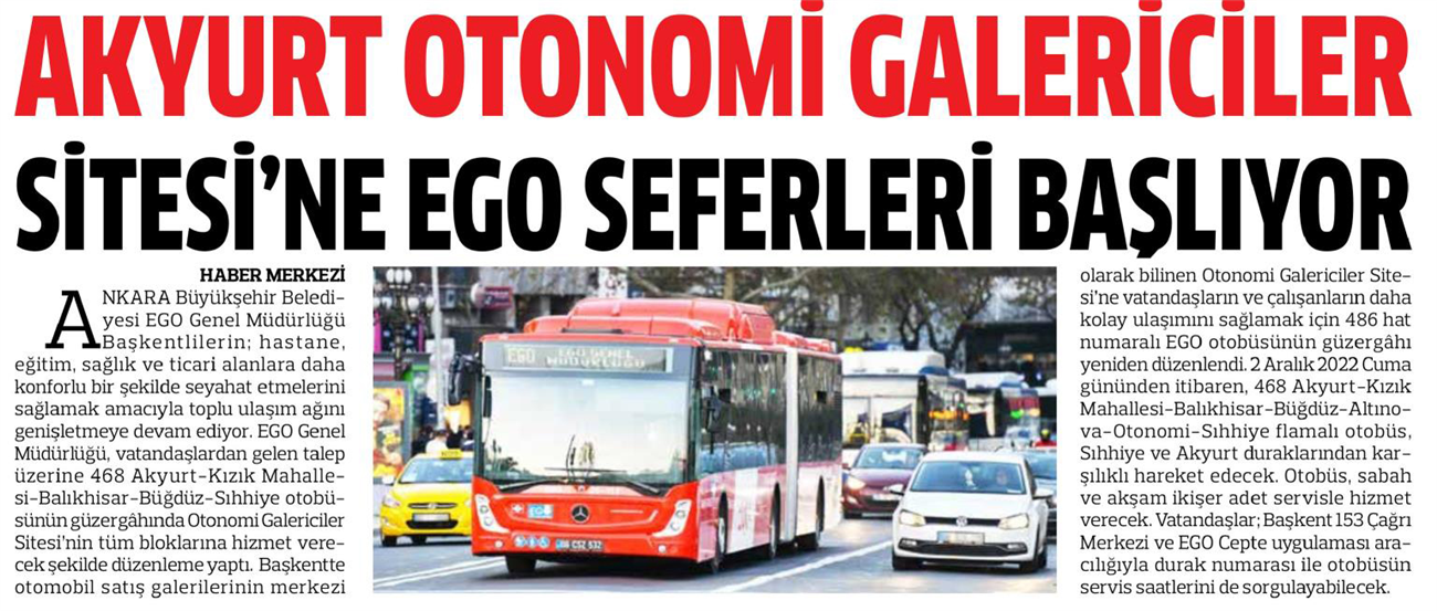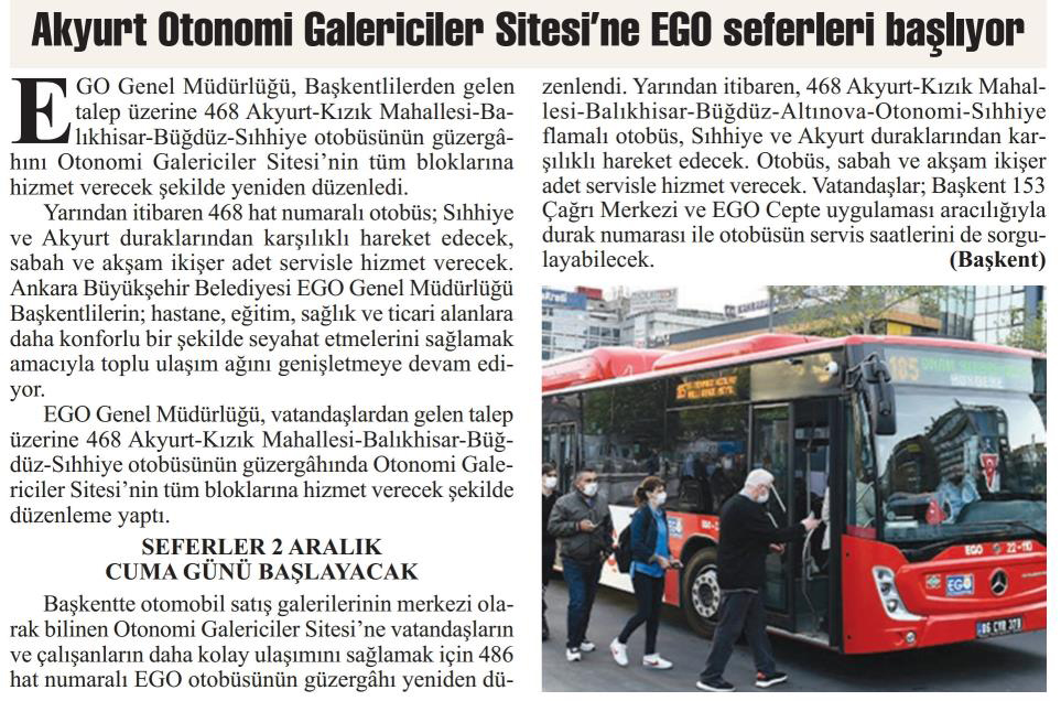 Başkent Gazetesi / 01.12.2022 Akyurt Otonomi Galericiler Sitesi'ne EGO seferleri başlıyor