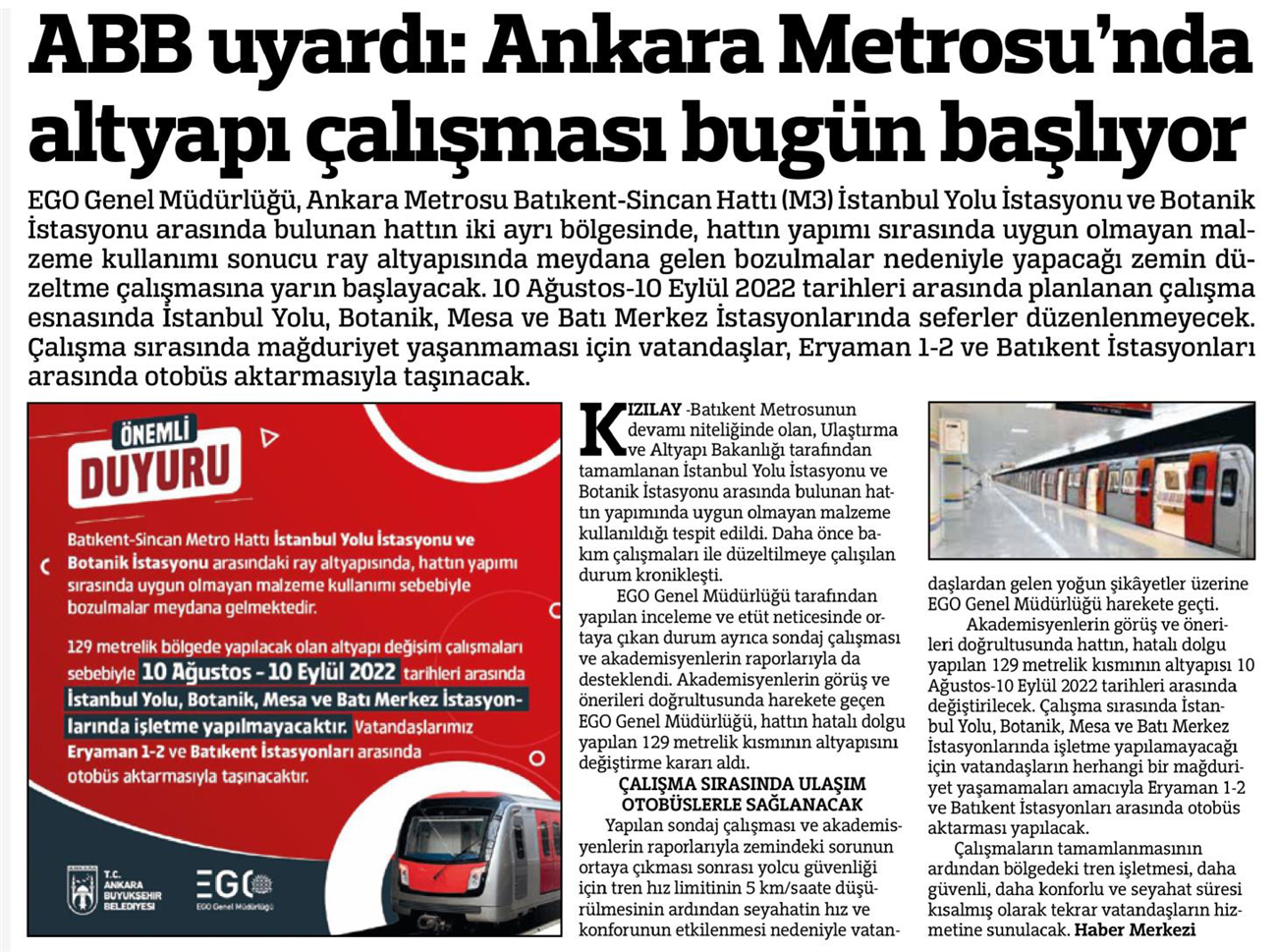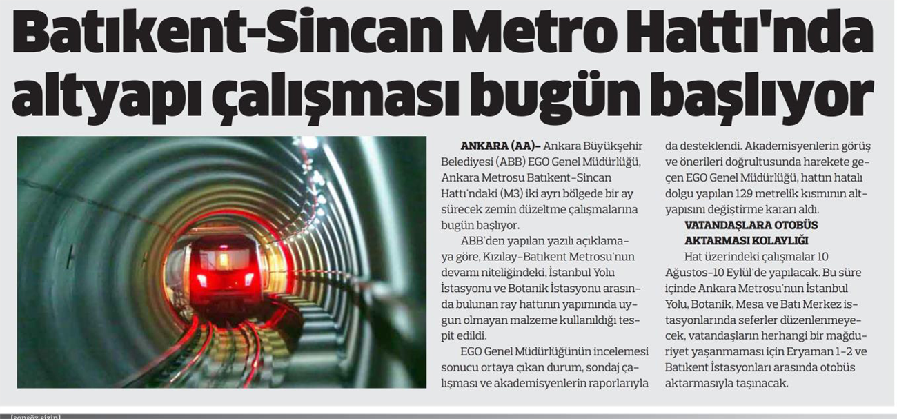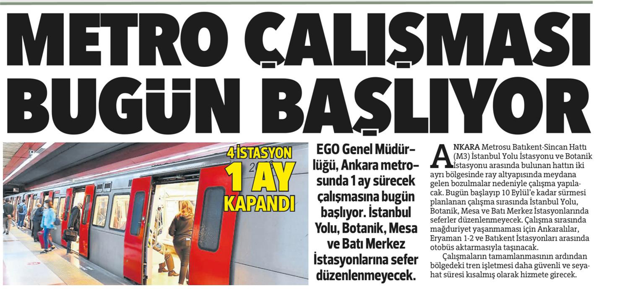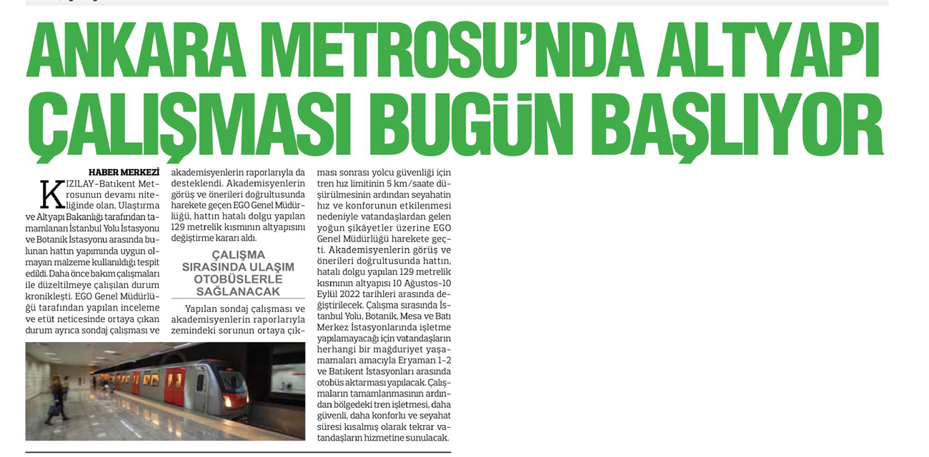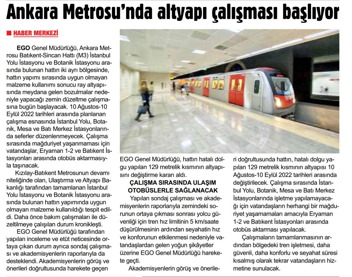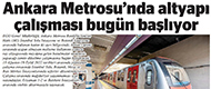 Başkent Gazetesi / 10.08.2022 Ankara Metrosu'nda altyapı çalışması başlıyor