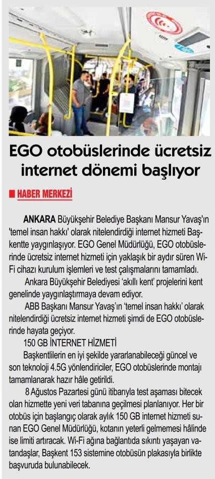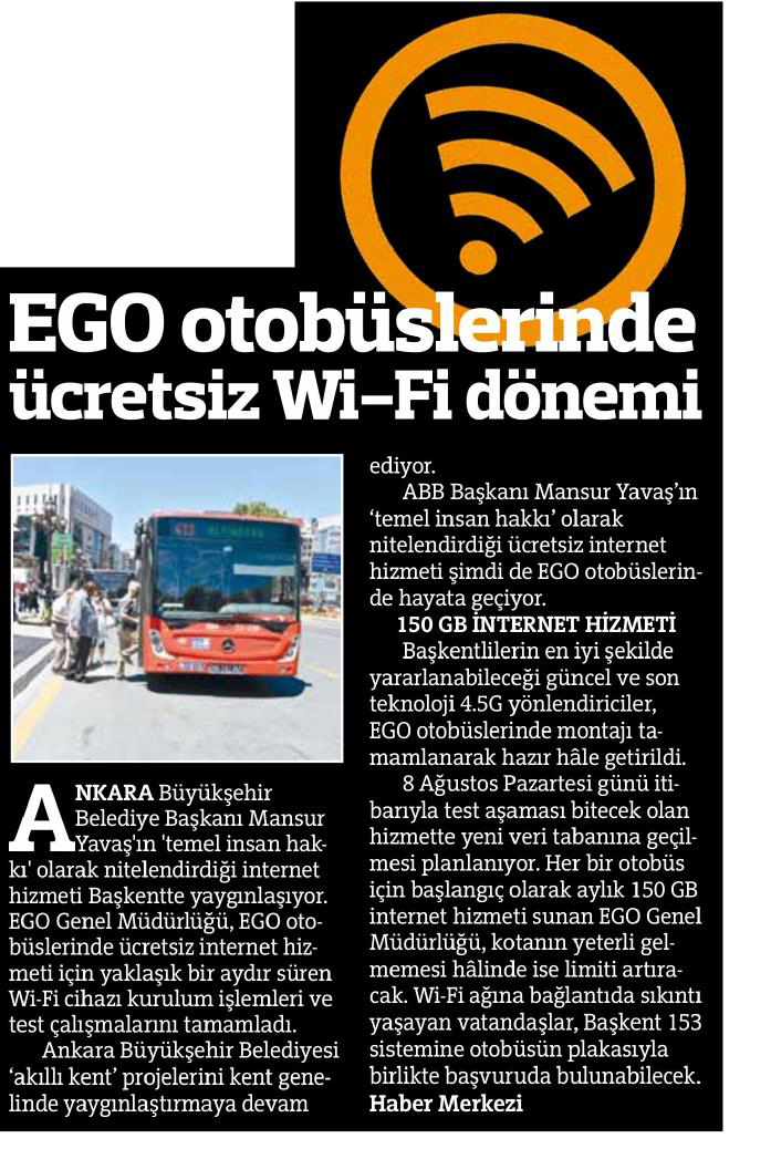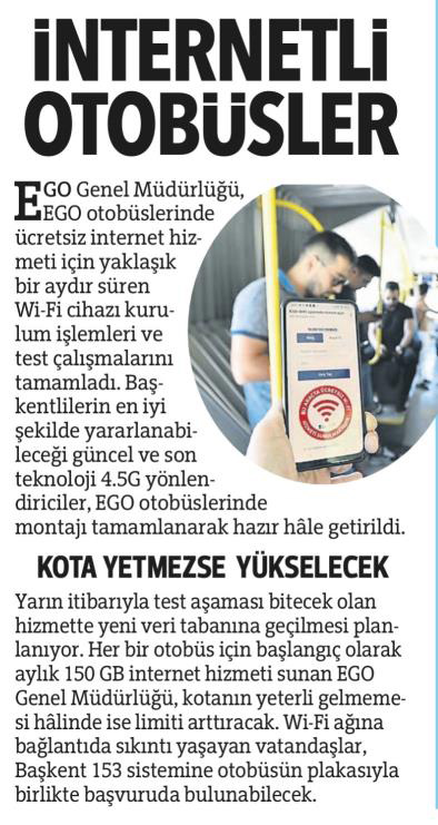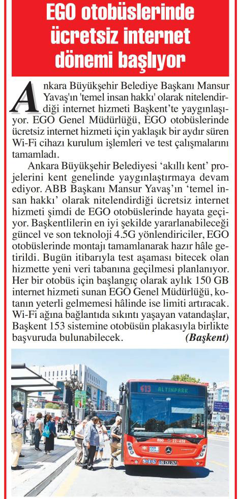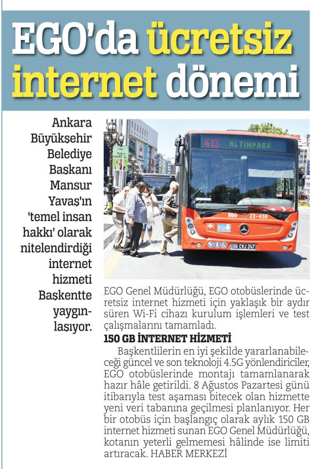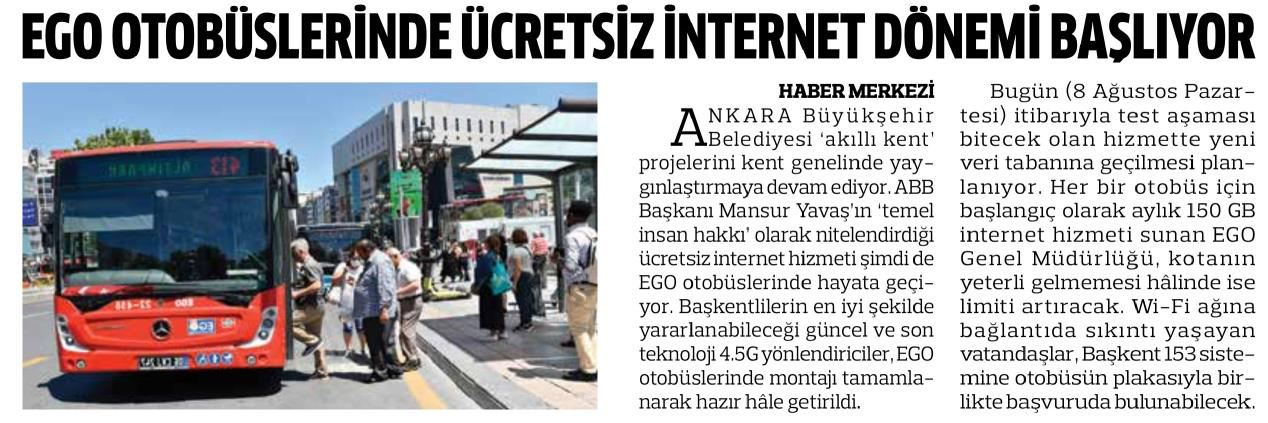 Başkent Gazetesi / 08.08.2022 EGO otobüslerinde ücretsiz internet dönemi başlıyor