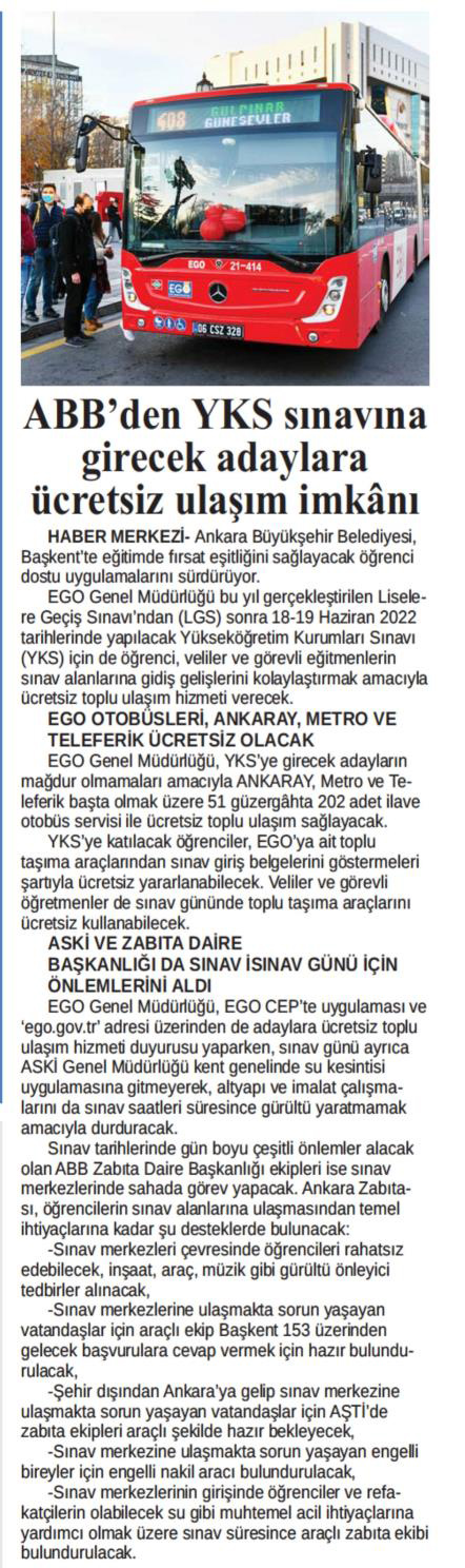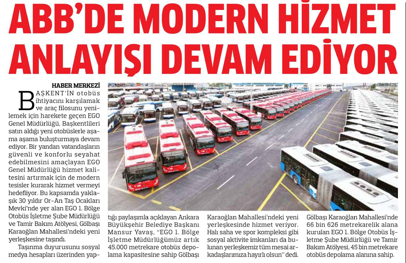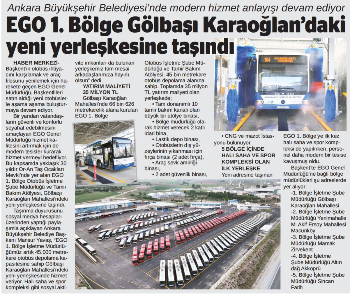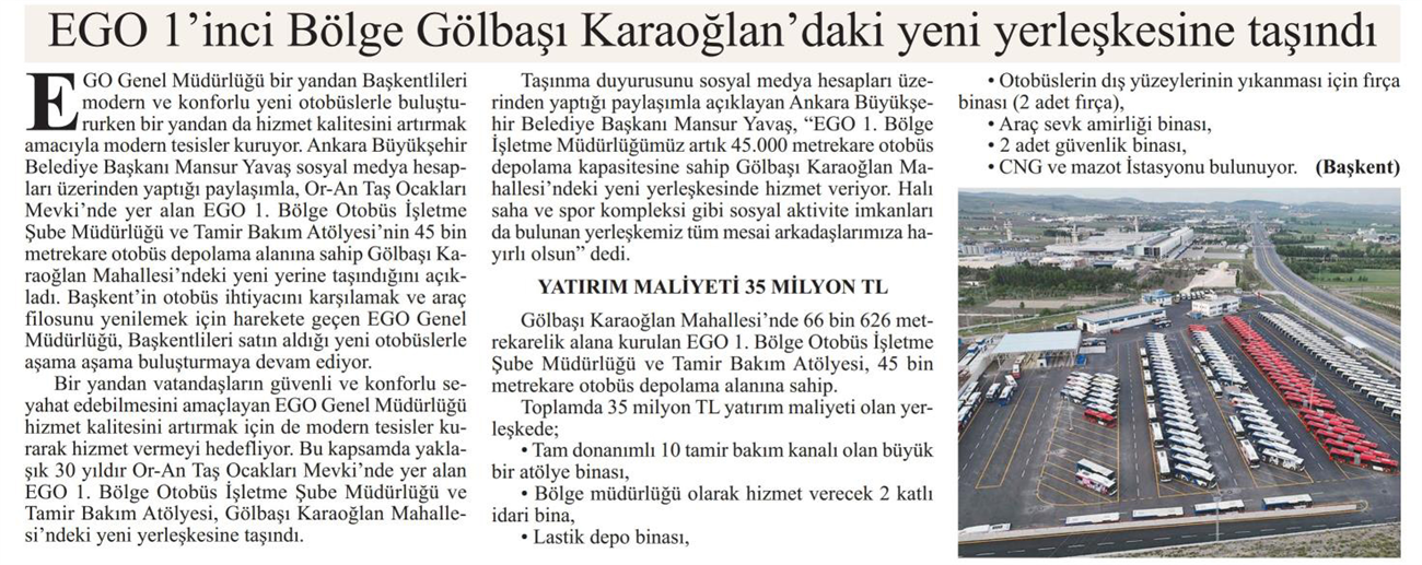 Başkent Gazetesi / 02.06.2022 EGO 1 'inci Bölge Gölbaşı Karaoğlan'daki yeni yerleşkesine taşındı