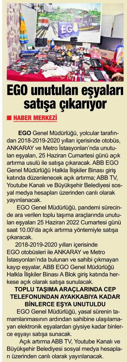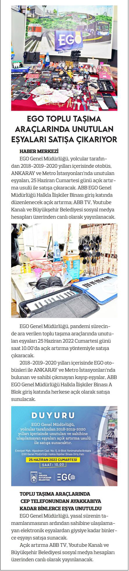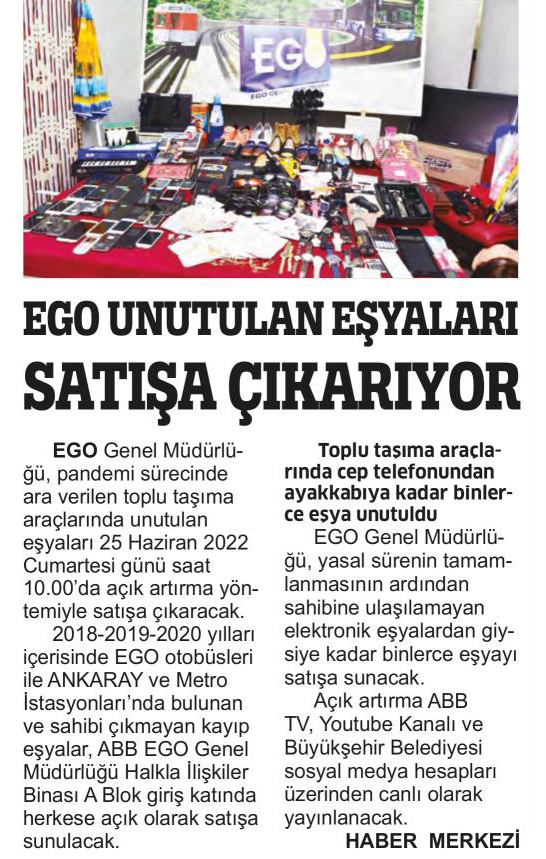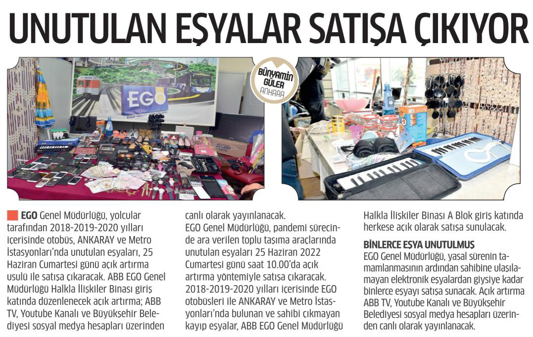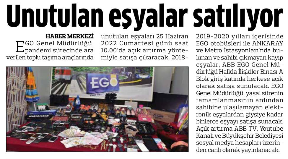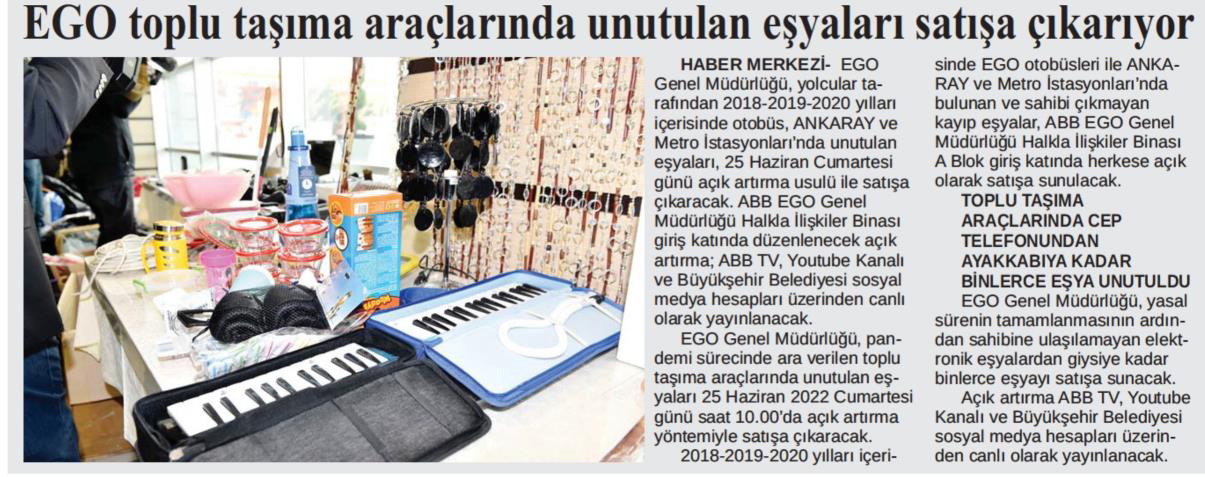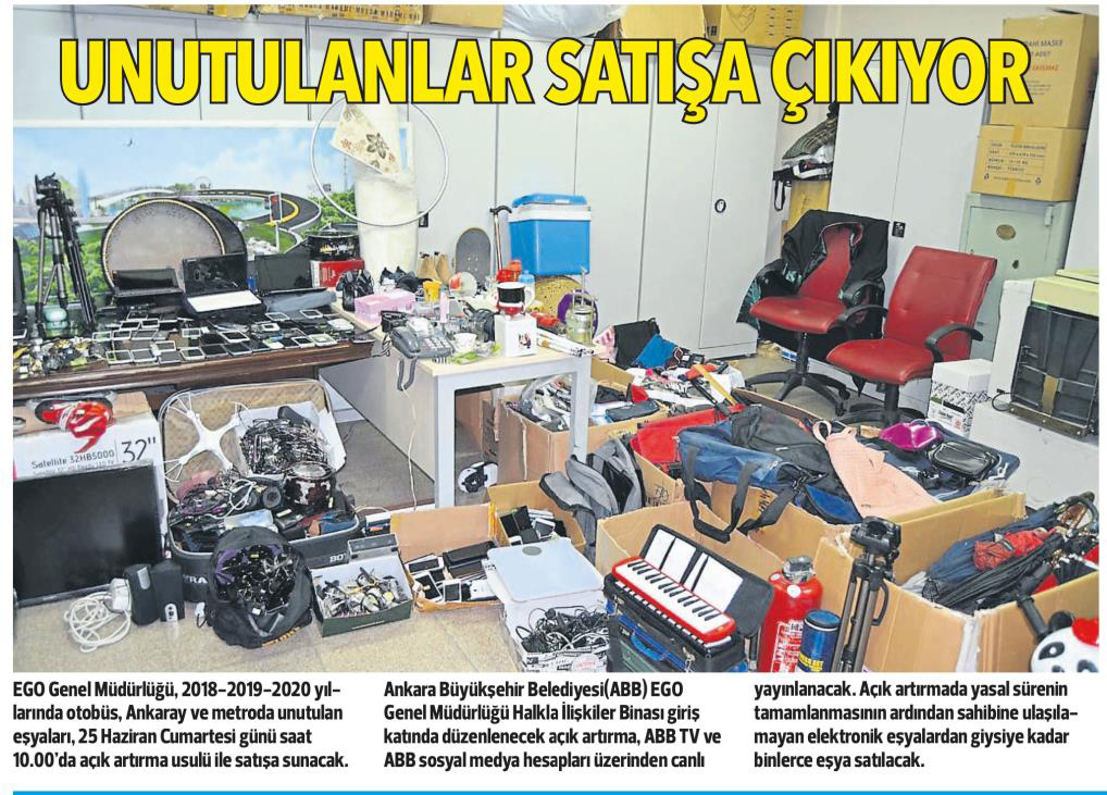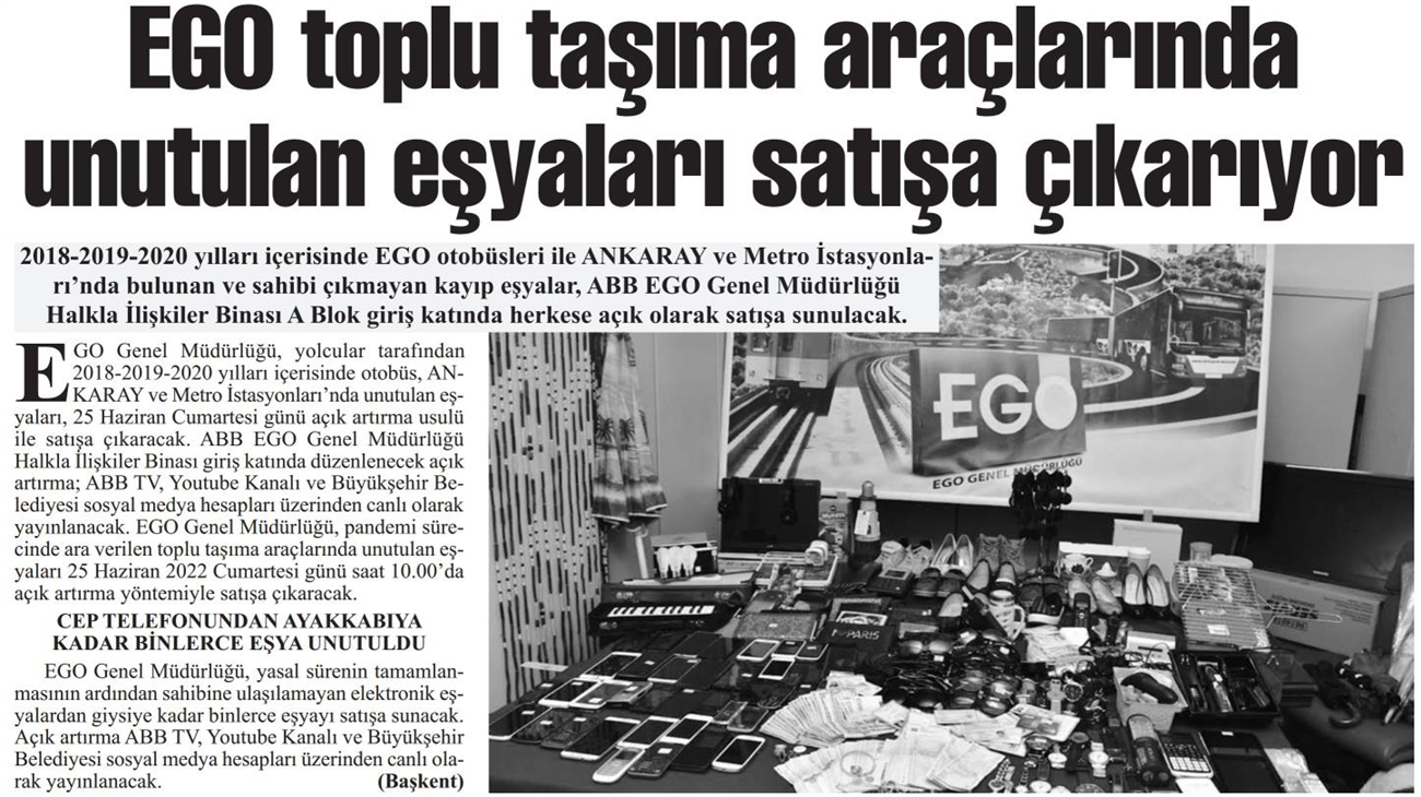 Başkent Gazetesi / 09.06.2022 Toplu taşıma araçlarında unutulan eşyaları satışa çıkarıyor