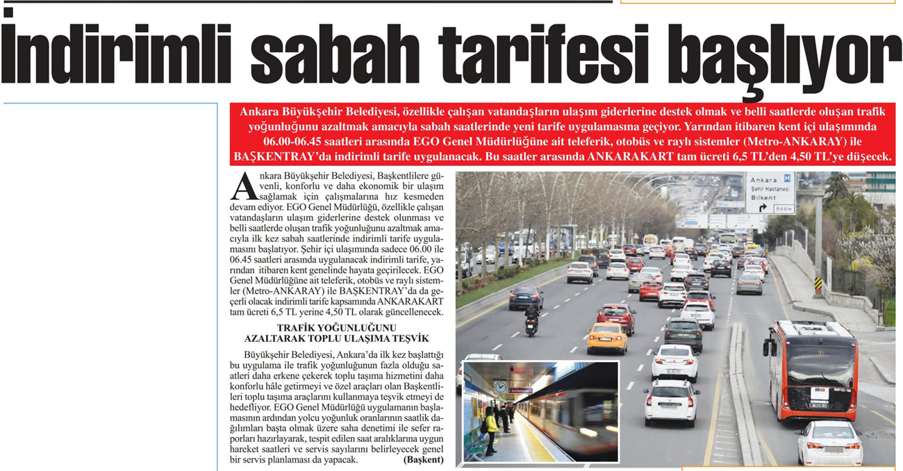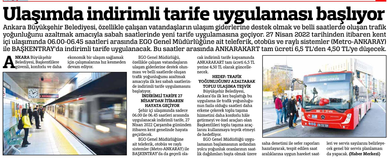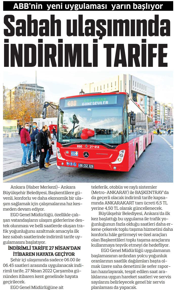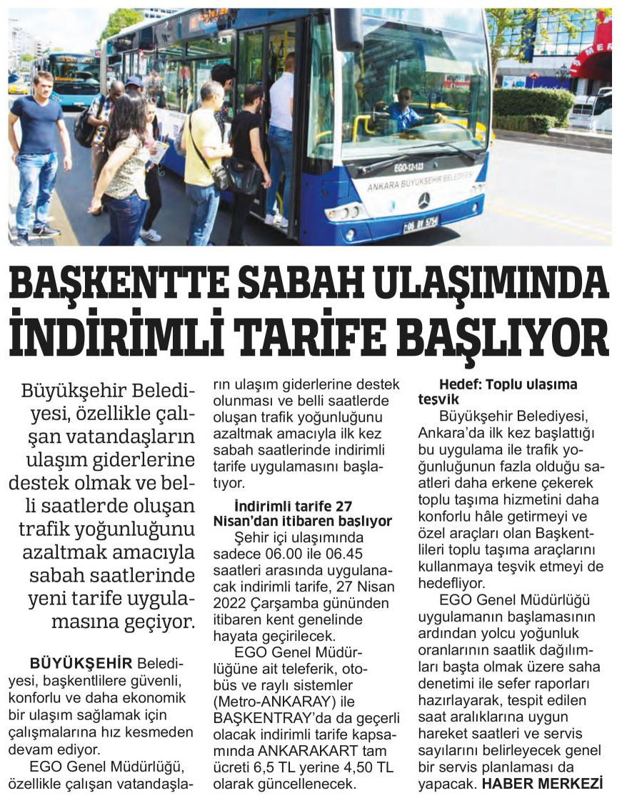 Başkent Gazetesi / 26.04.2022 İndirimli sabah tarifesi başlıyor