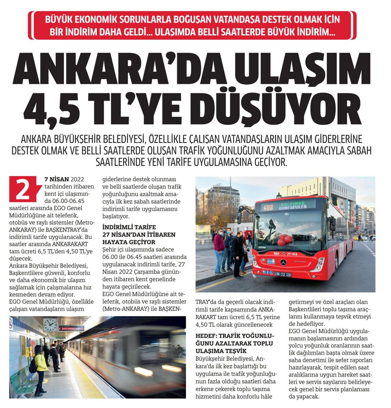 Milli Gazete / 26.04.2022 Ankara'da ulaşım 4,5 tl'ye düşüyor