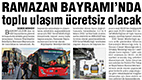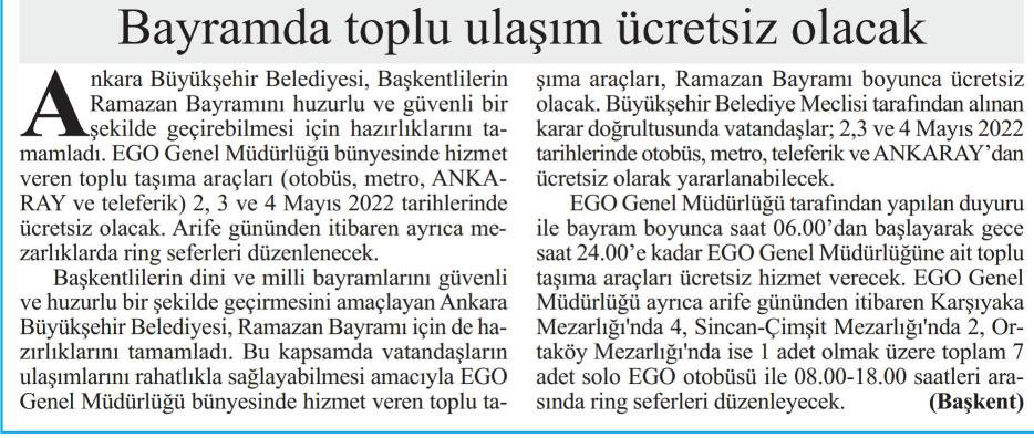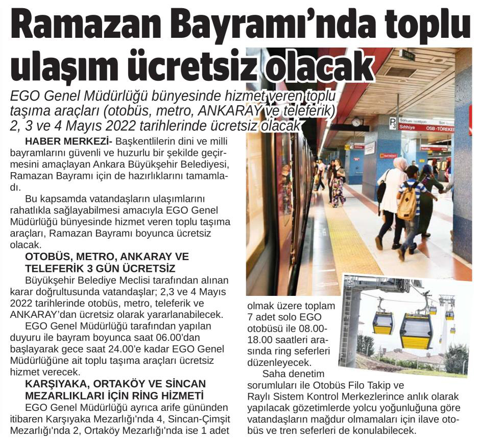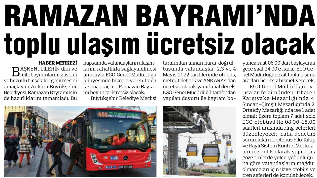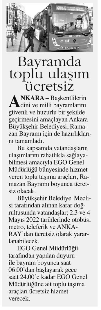 Başkent Gazetesi / 28.04.2022 Bayramda toplu ulaşım ücretsiz olacak