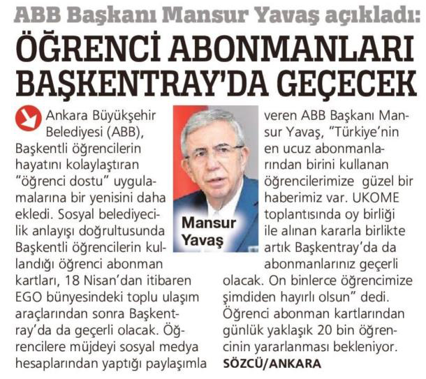Sözcü / 15.04.2022 Öğrenci abonmanları Başkentray da geçecek