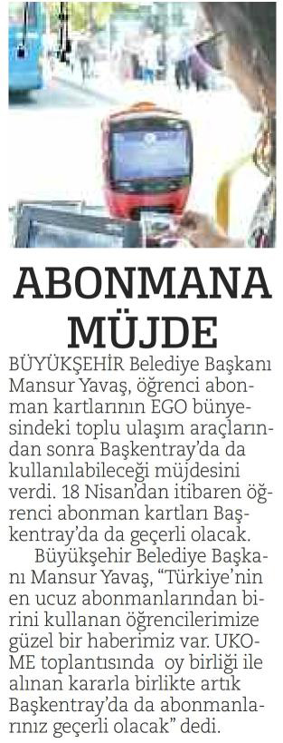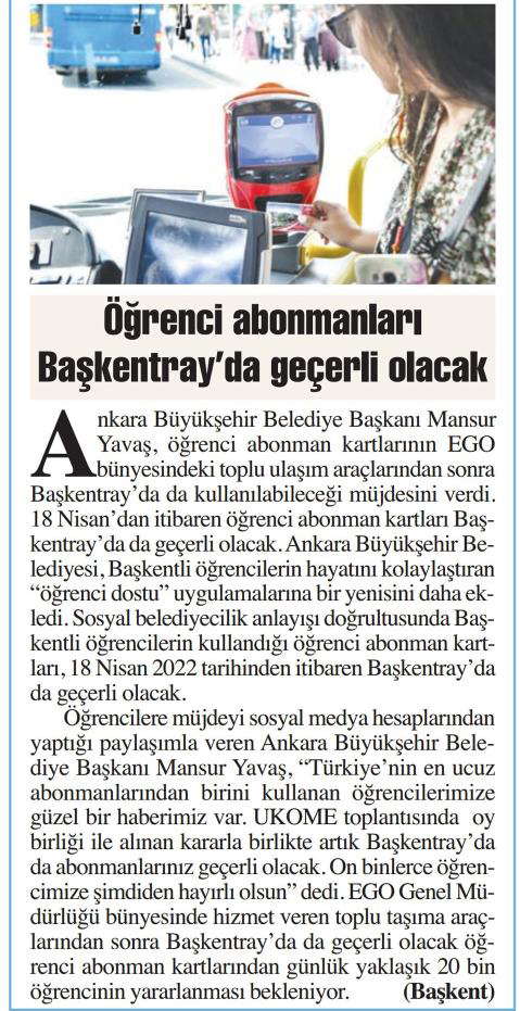 Başkent Gazetesi / 15.04.2022 Öğrenci abonmanları Başkentray'da geçerli olacak