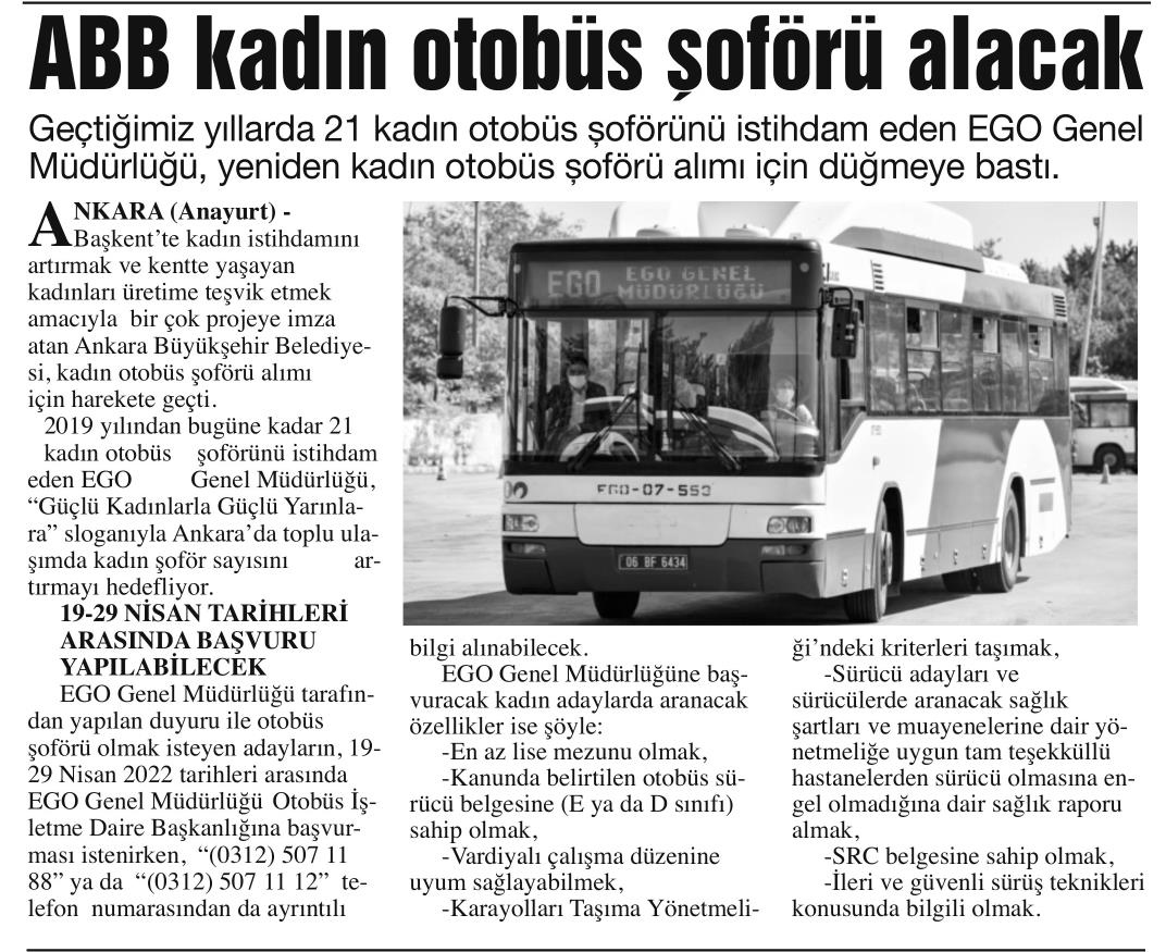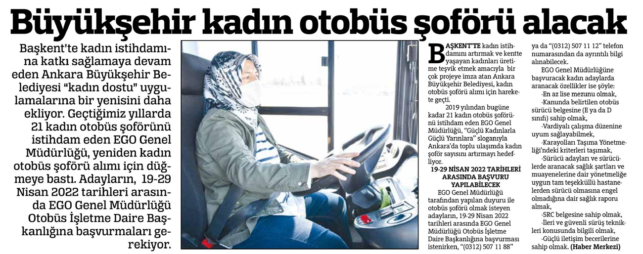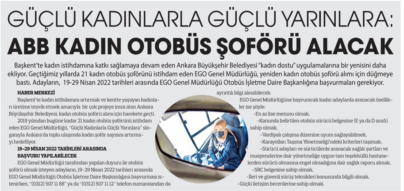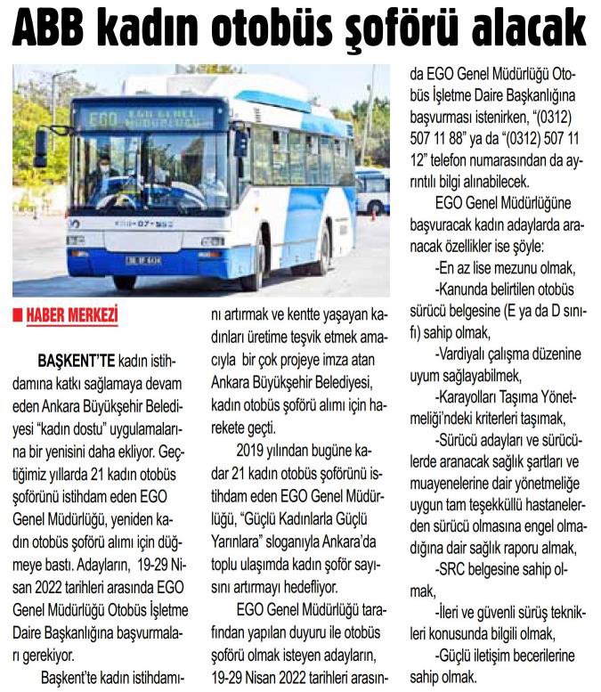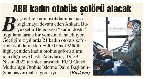 Başkent Gazetesi / 20.04.2022 ABB Kadın otobüs şoförü alacak