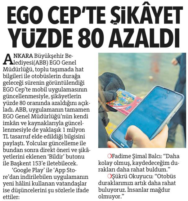 Hürriyet Ankara / 29.01.2022 EGO CEP'te şikâyet yüzde 80 azaldı