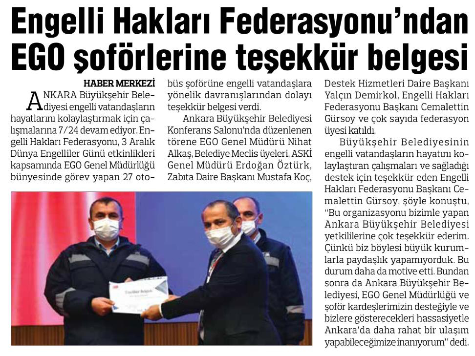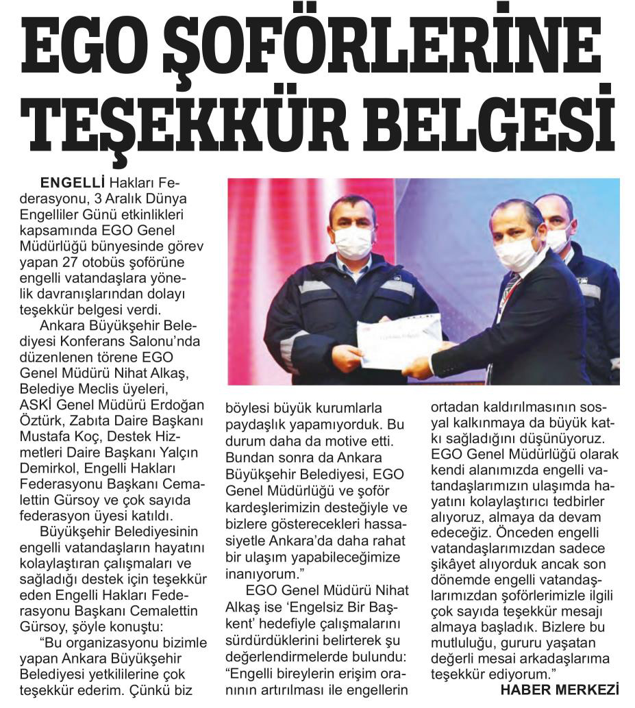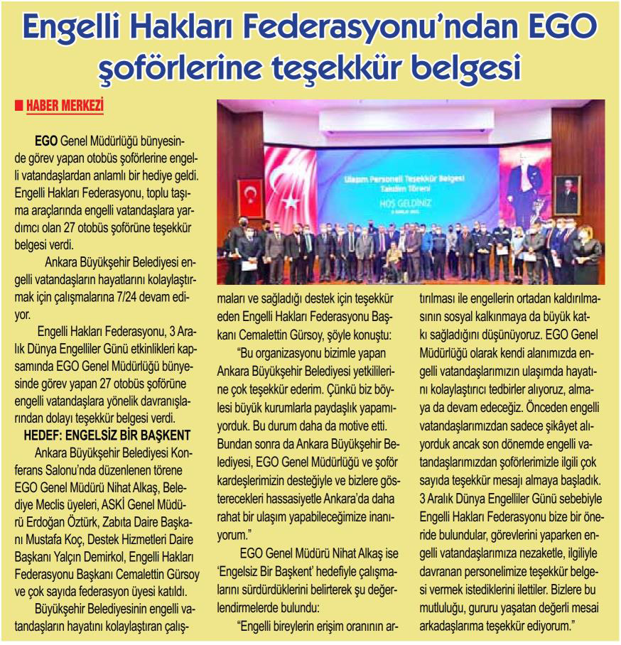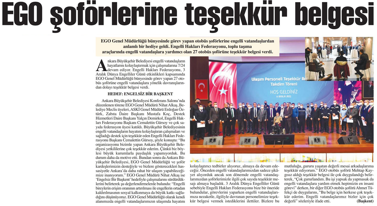 Başkent Gazetesi / 08.12.2021 EGO şoförlerine teşekkür belgesi