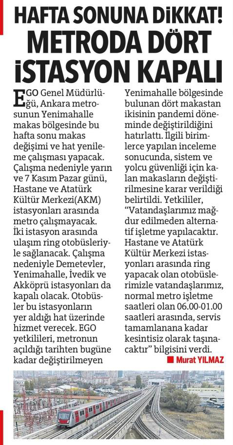 Hürriyet Ankara / 05.11.2021 Hafta sonu dört istasyon kapalı