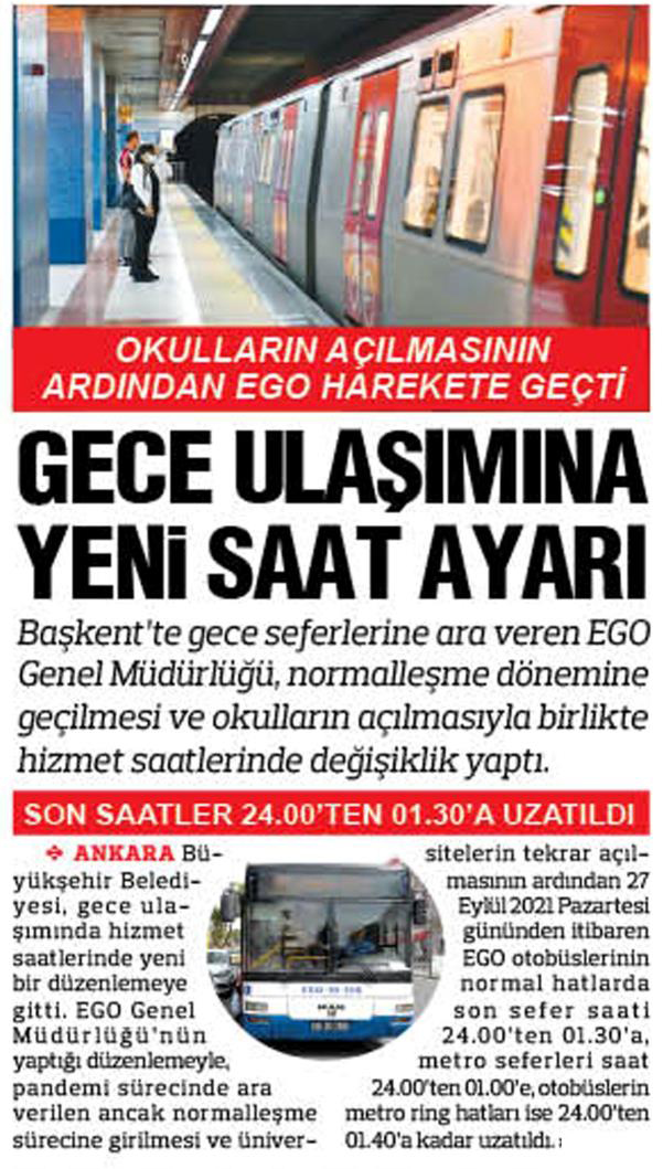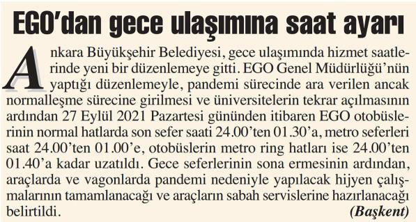 Başkent Gazetesi / 25.09.2021 EGO’dan gece ulaşımına saat ayarı