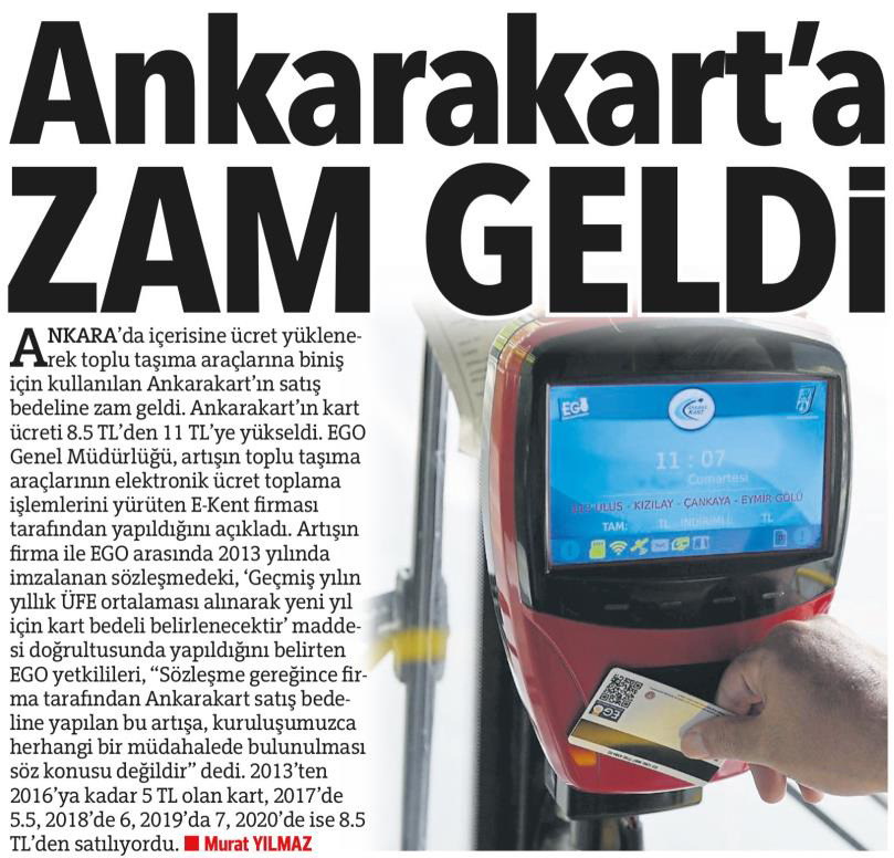 Hürriyet Ankara / 08.09.2021 Ankarakart’a zam geldi