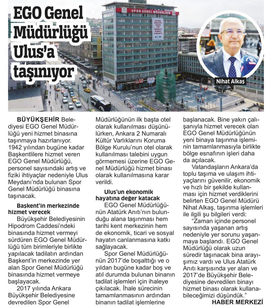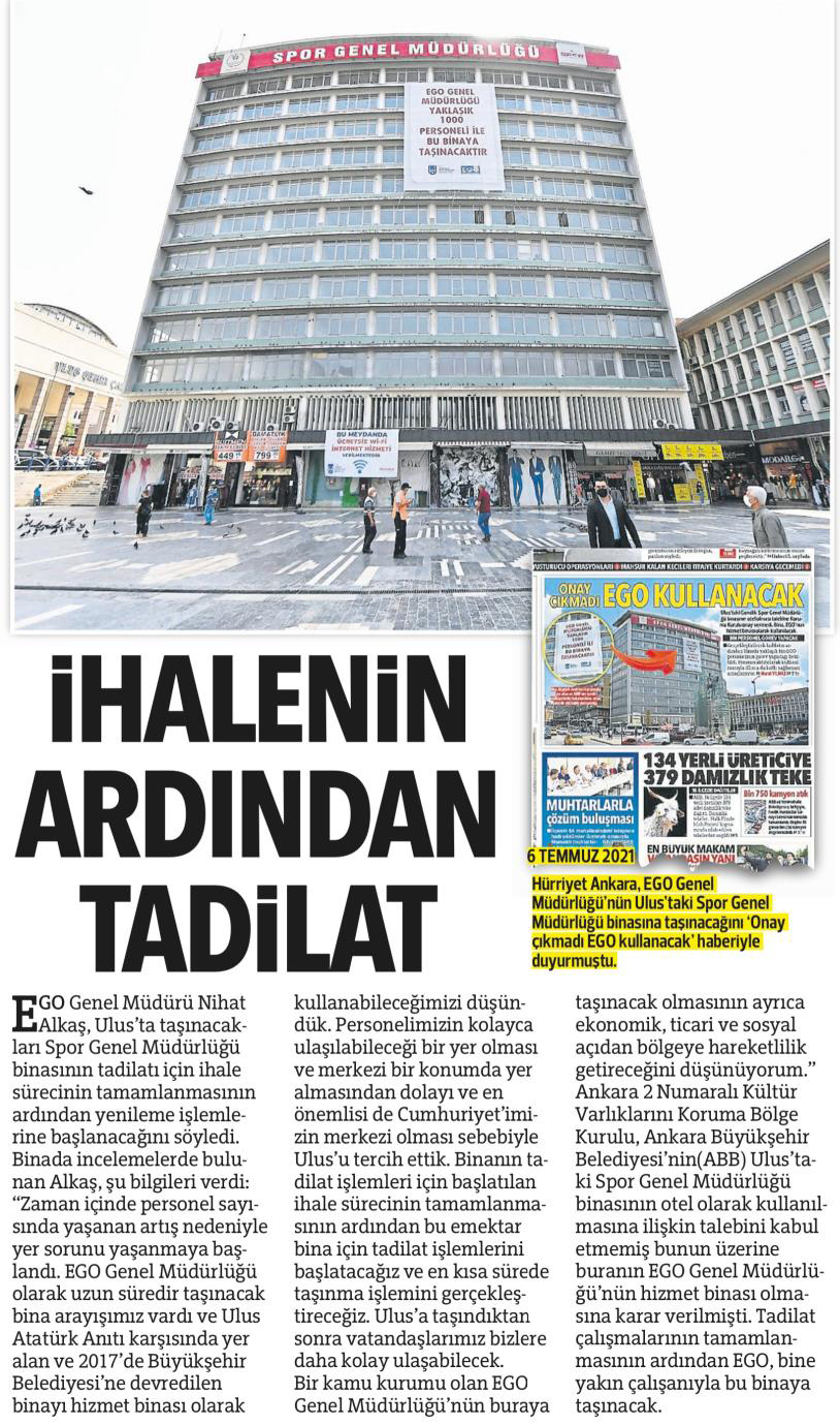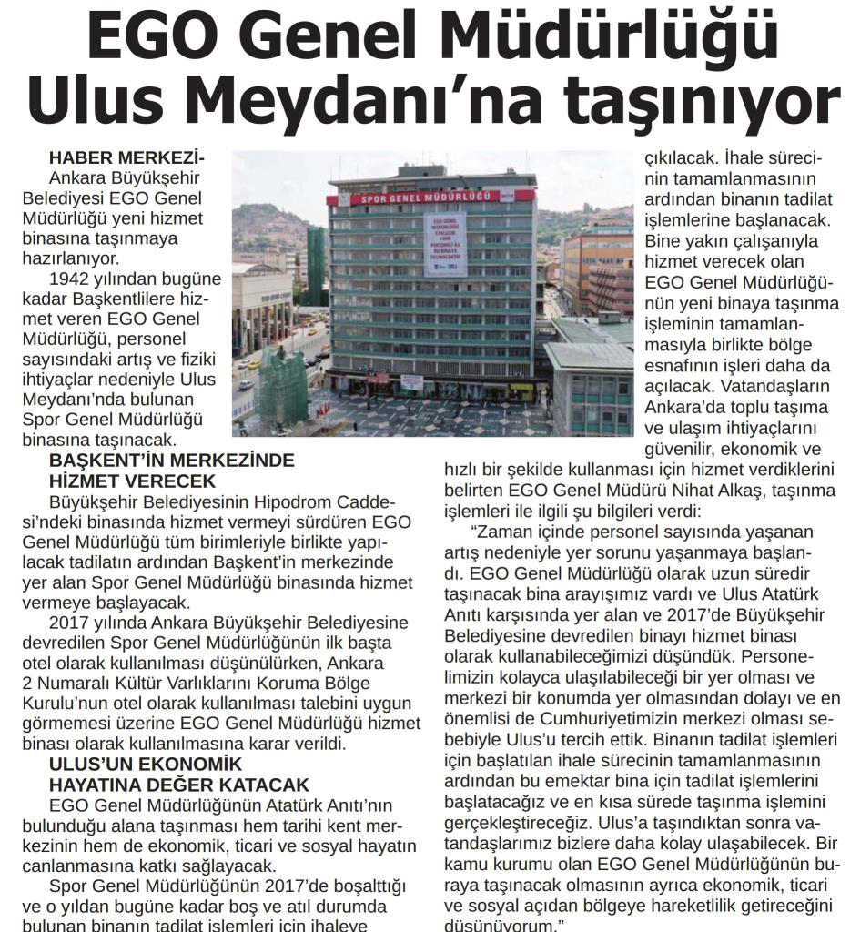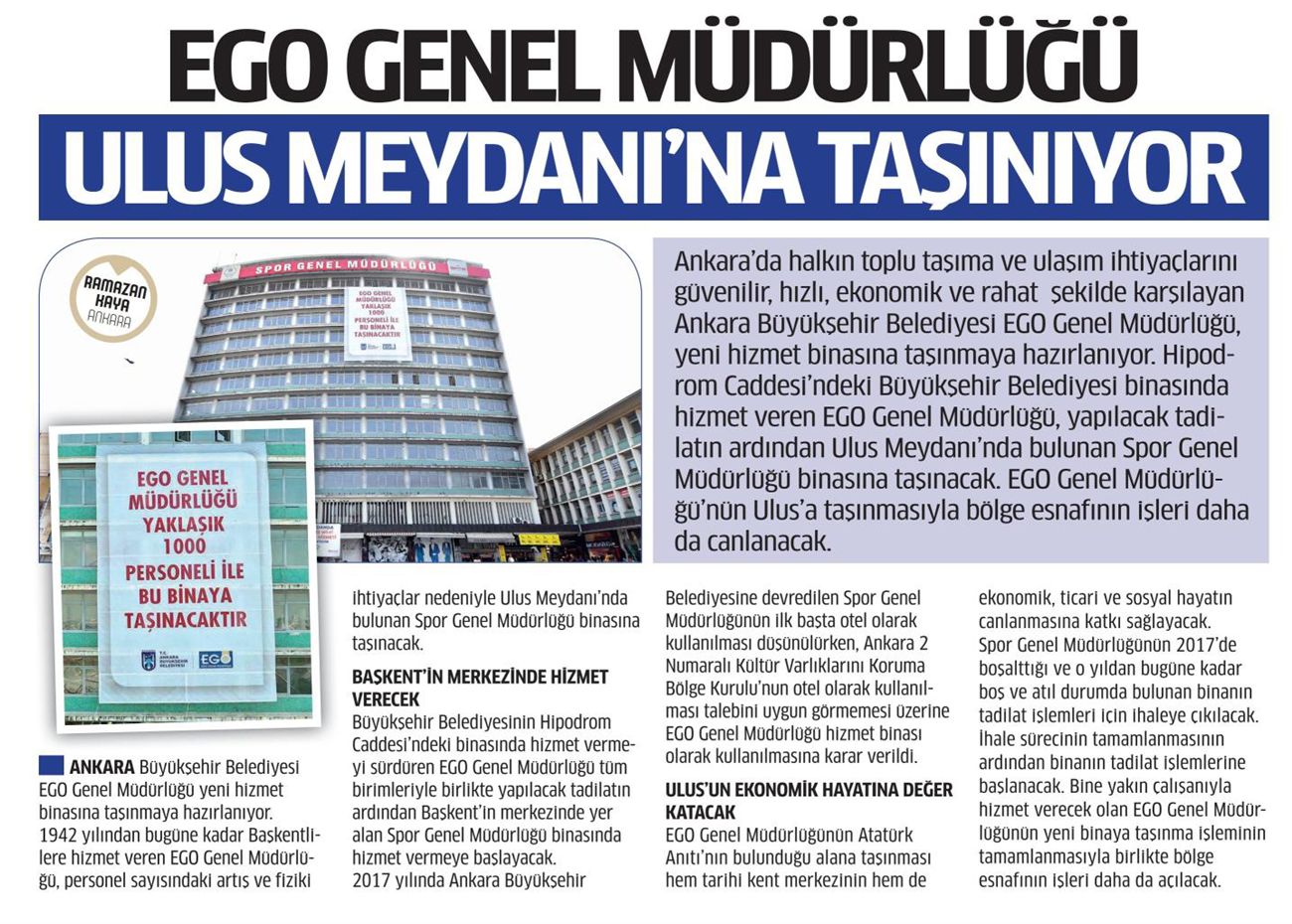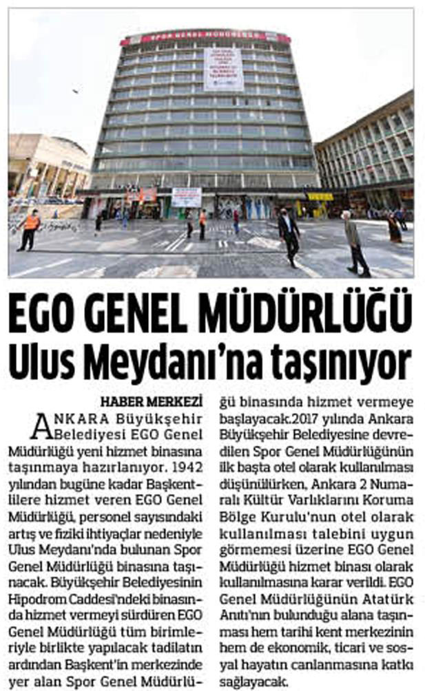 Başkent Gazetesi / 26.07.2021 EGO Genel Müdürlüğü Ulus Meydanı’na taşınıyor