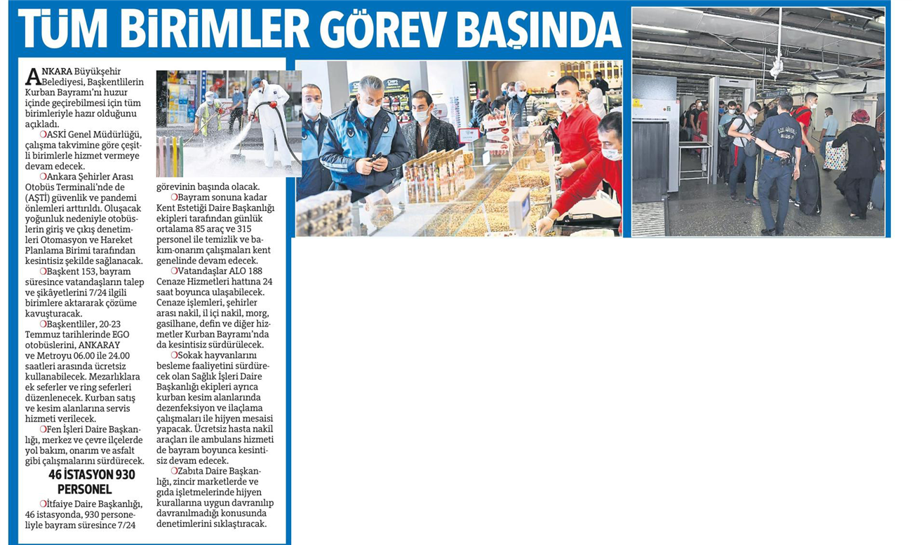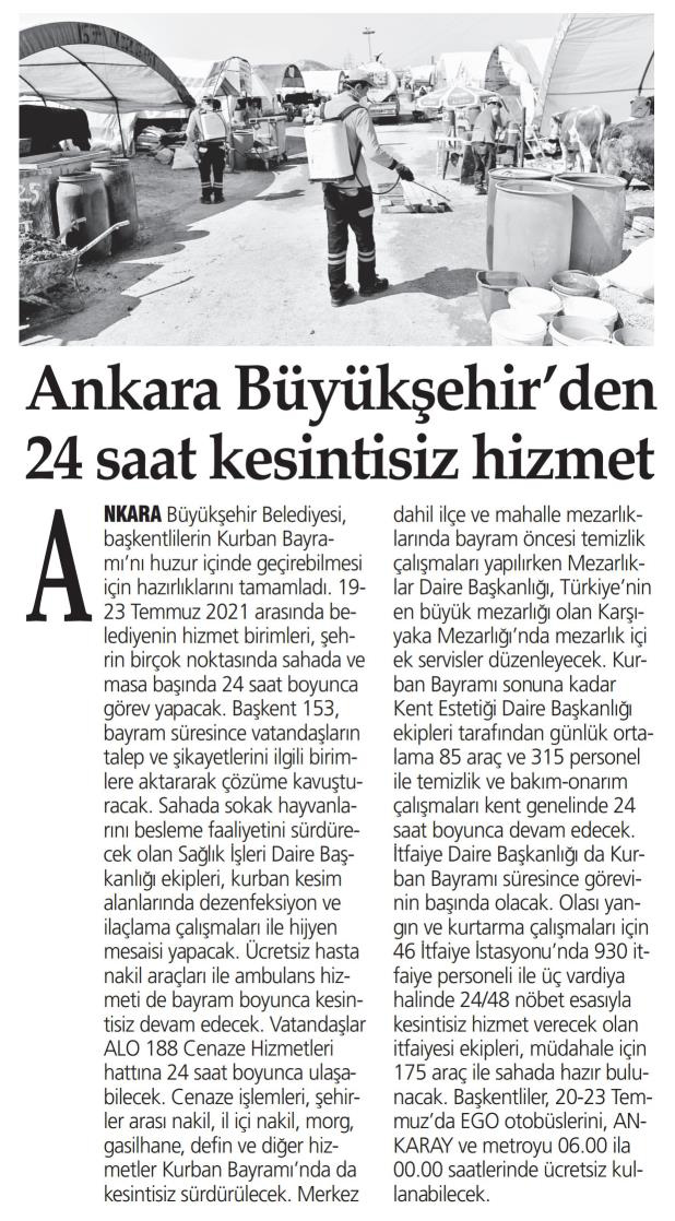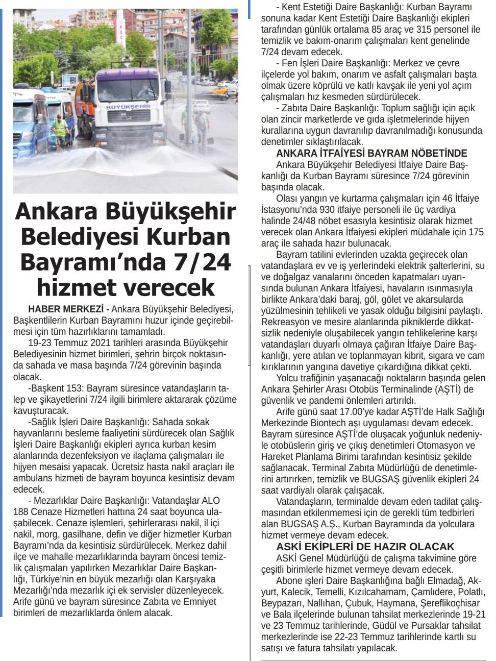Başkent Gazetesi / 19.07.2021 Kurban Bayramı’nda 7/24 hizmet verecek