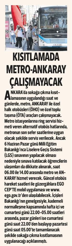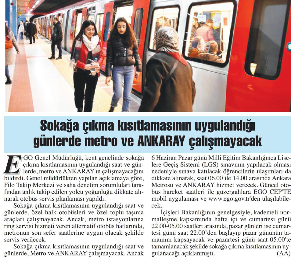 Başkent Gazetesi / 03.06.2021 Sokağa çıkma yasağında metro ve ANKARAY çalışmayacak