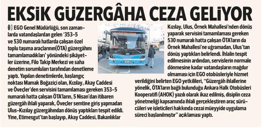Hürriyet Ankara / 10.04.2021 Eksik güzergaha ceza geliyor