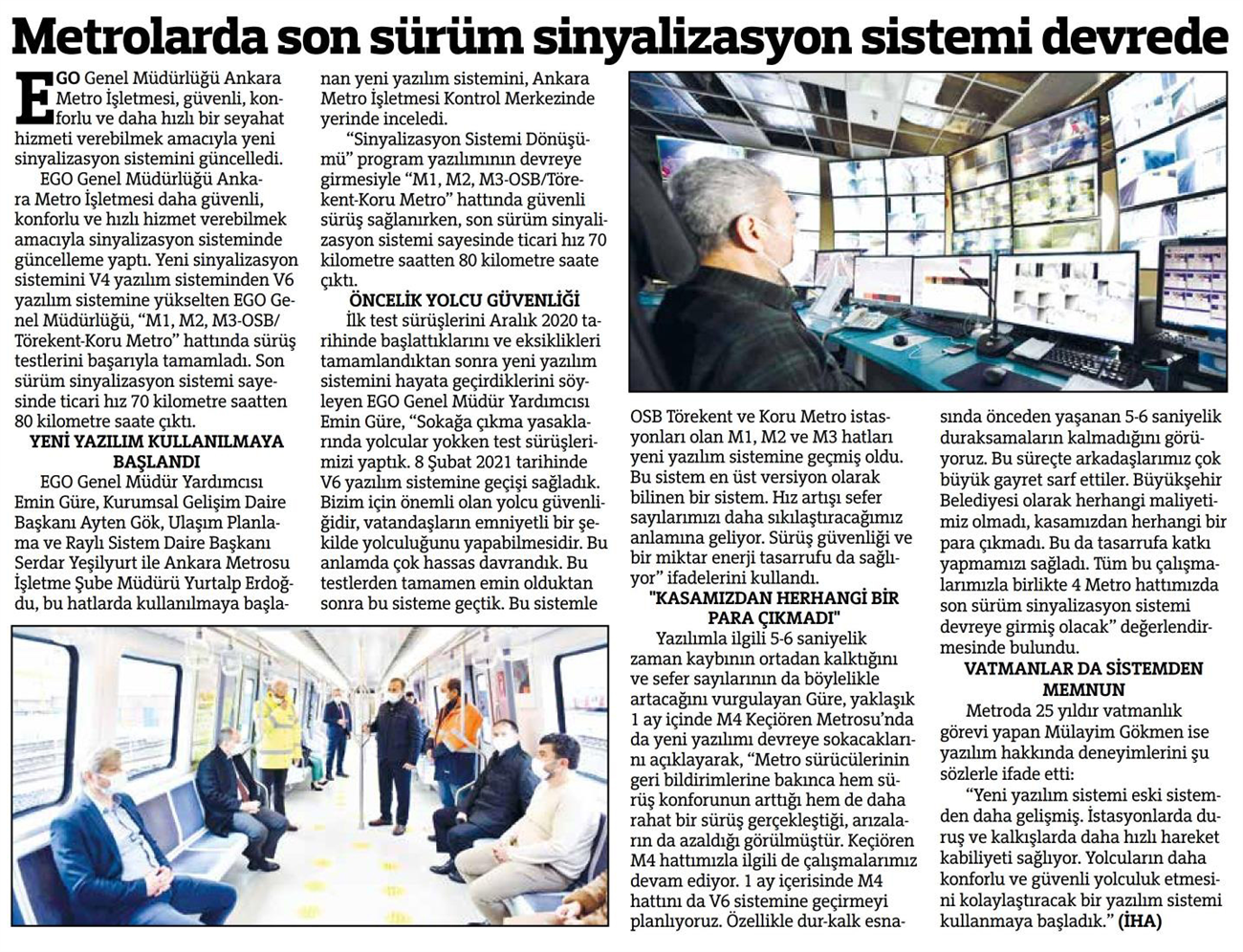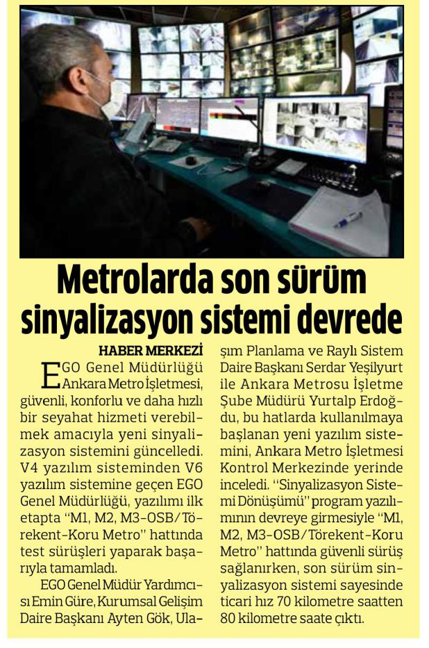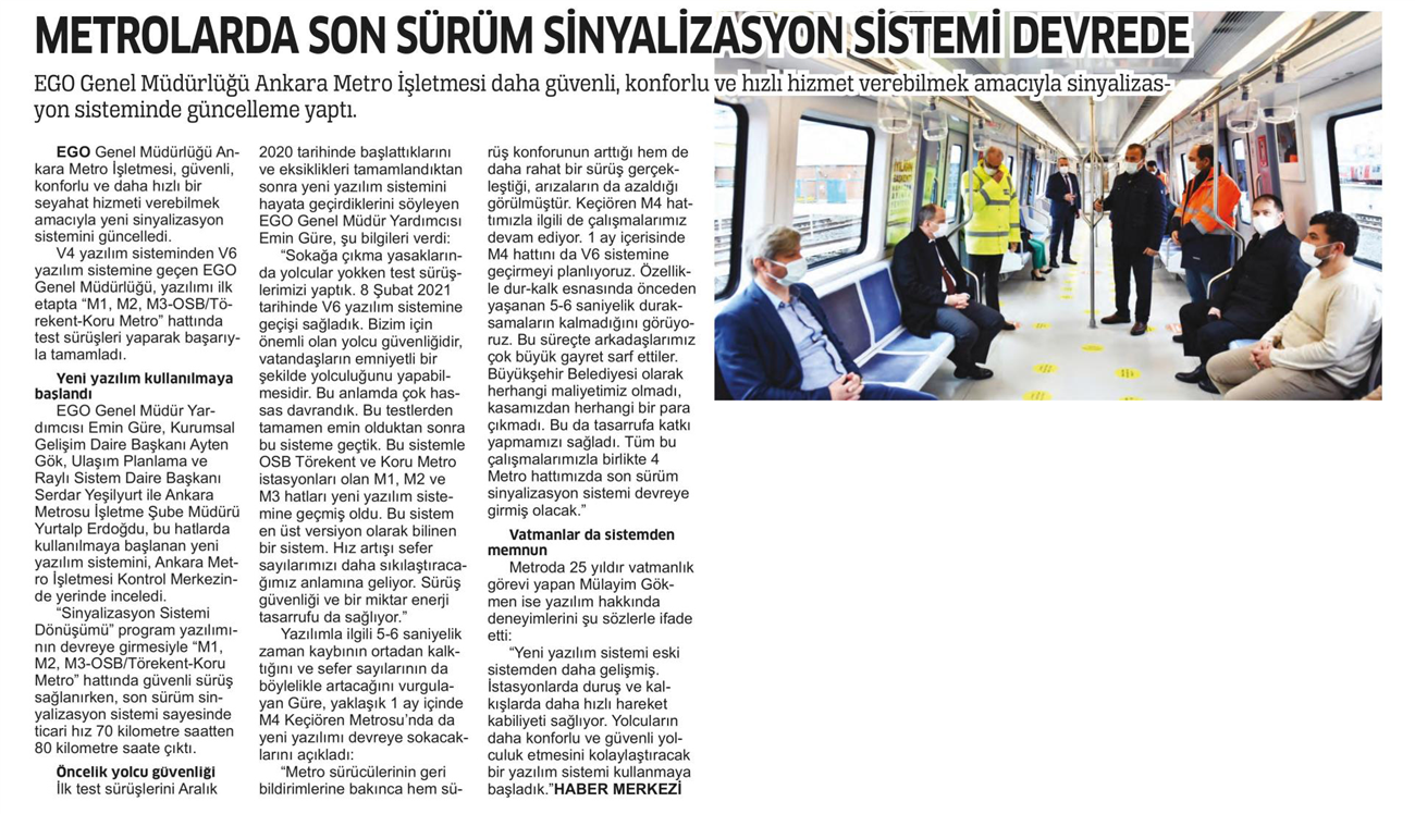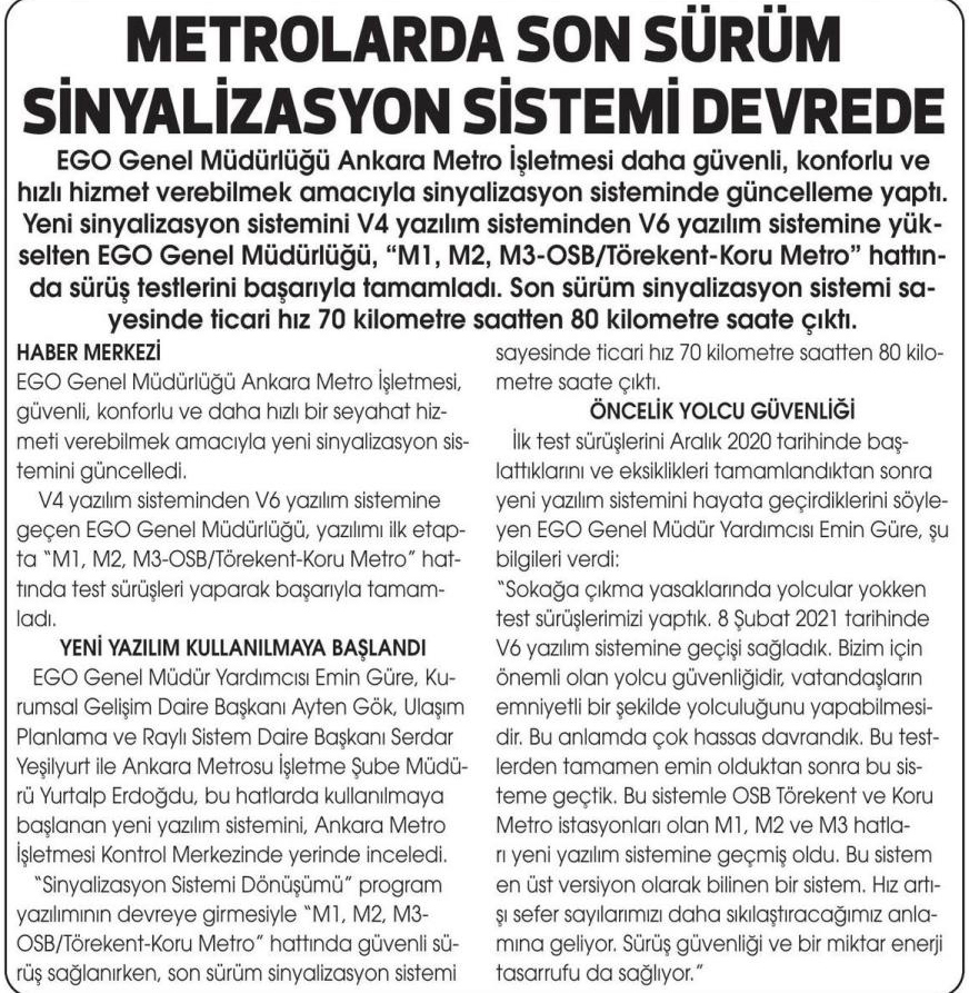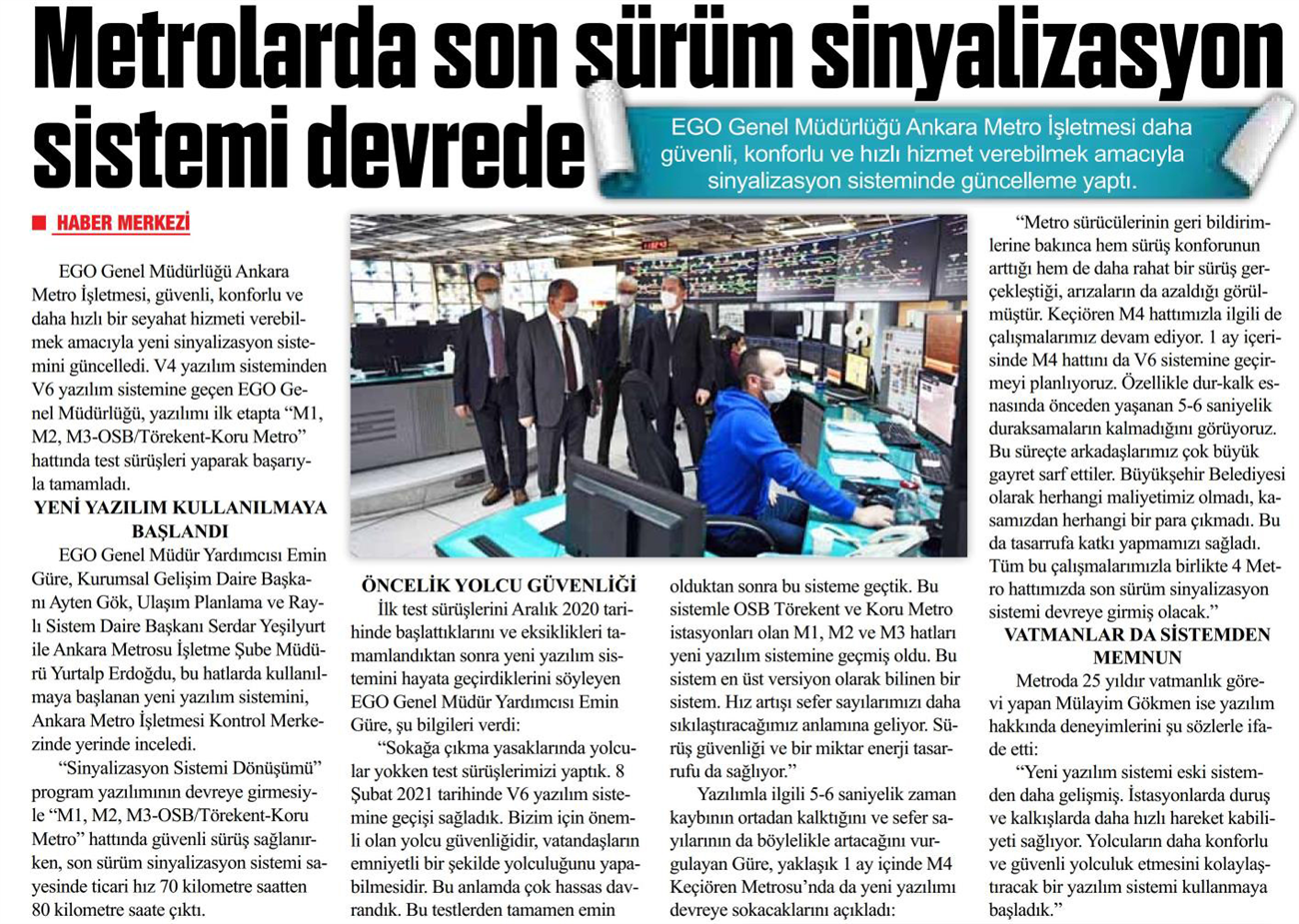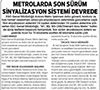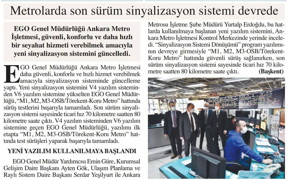 Başkent Gazetesi / 16.04.2021 Metrolarda son sürüm sinyalizasyon sistemi devrede