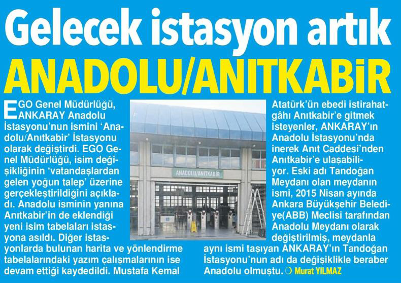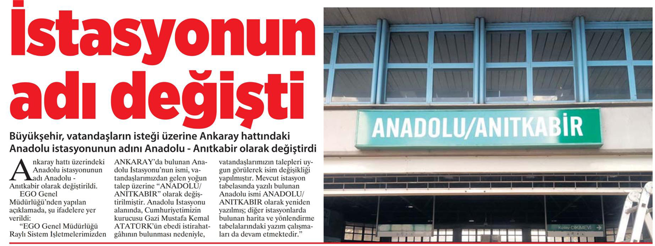 Milliyet Ankara / 19.04.2021 İstasyonun adı değişti
