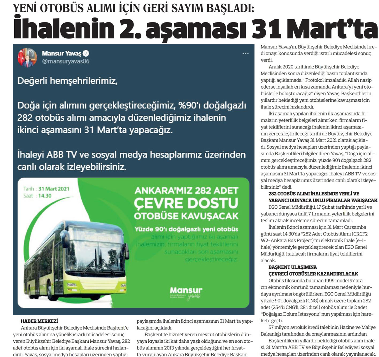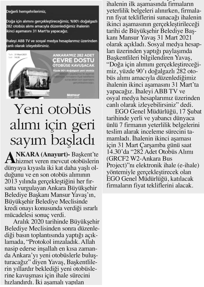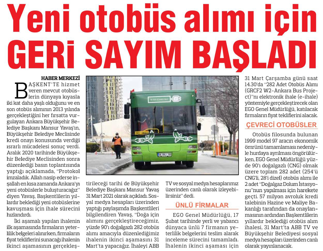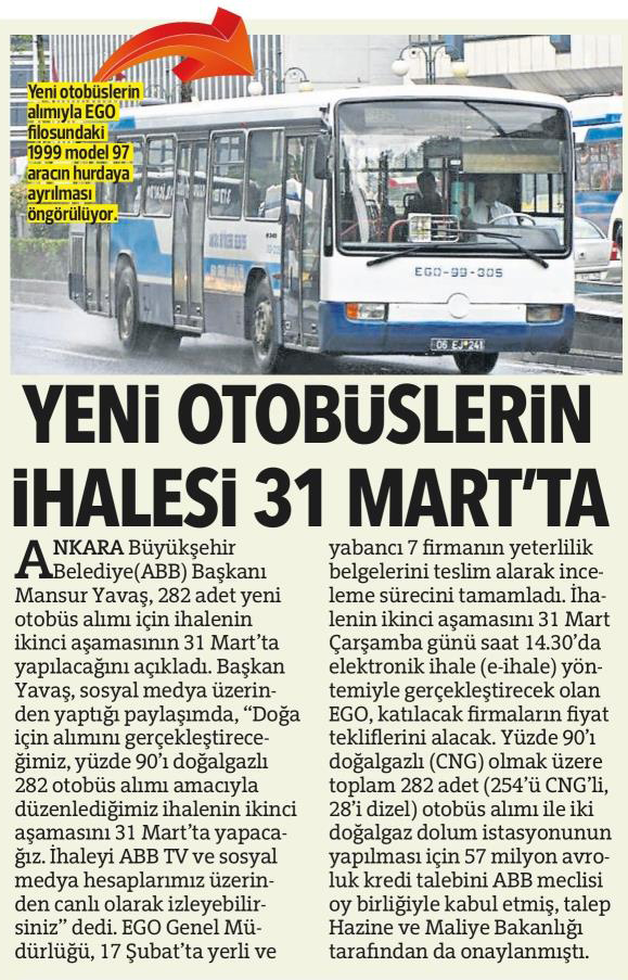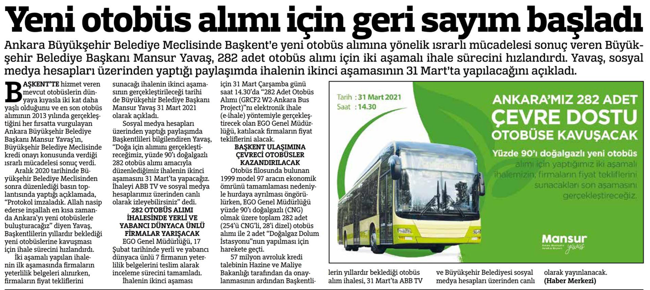 Hürriyet Ankara / 18.03.2021 Yeni otobüslerin ihalesi 31 Mart’ta