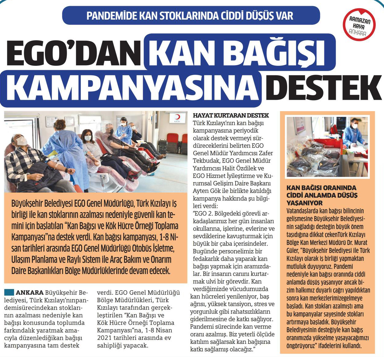 Hürriyet Ankara / 03.04.2021 Kan bağışı kampanyasına EGO'dan destek