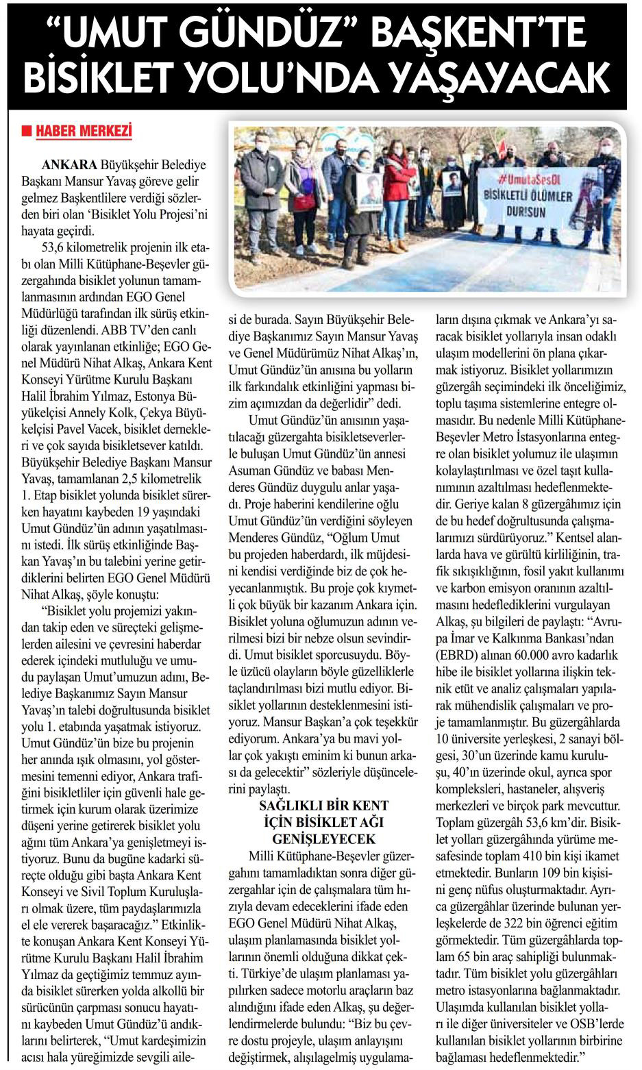 Zafer / 08.02.2021 “Umut Gündüz” Başkent’te bisiklet yolu’nda yaşayacak