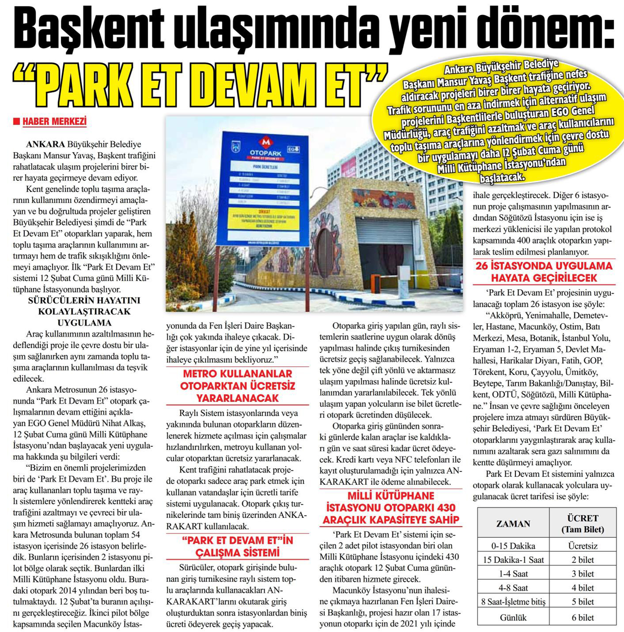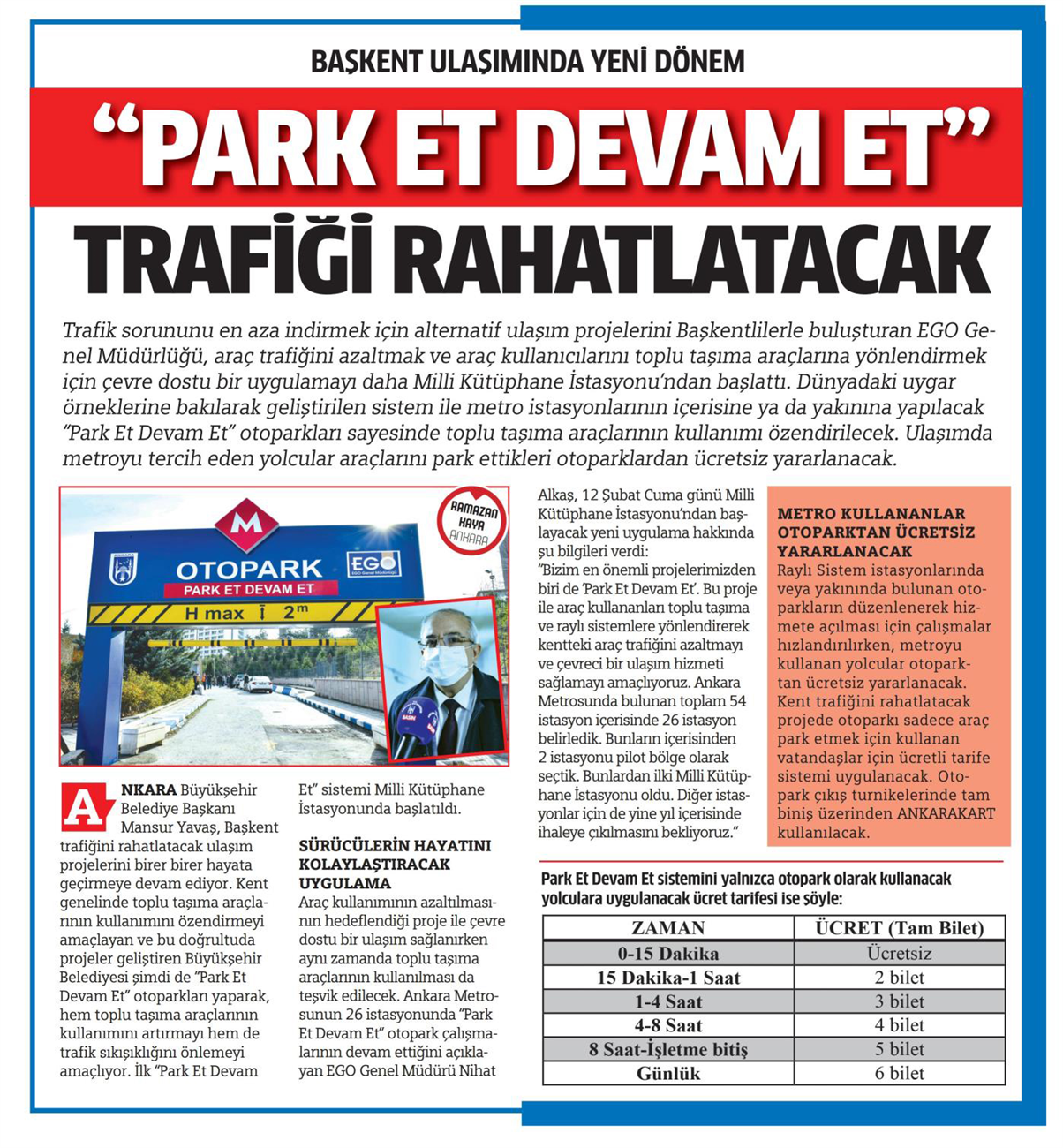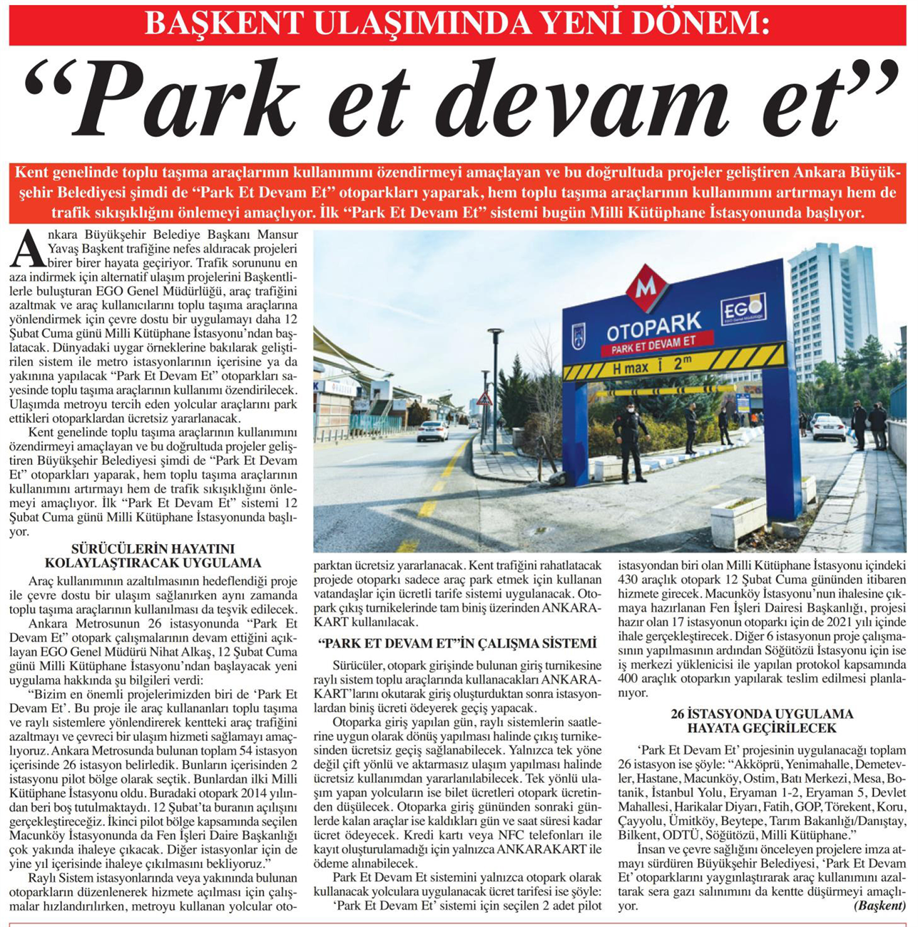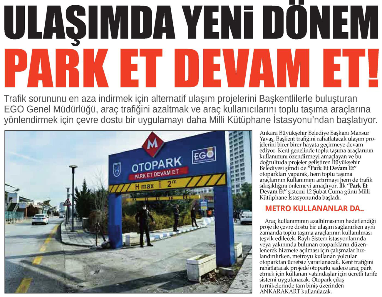 Başkent Gazetesi / 12.02.2021 Başkent ulaşımında yeni dönem: “Park Et Devam Et”