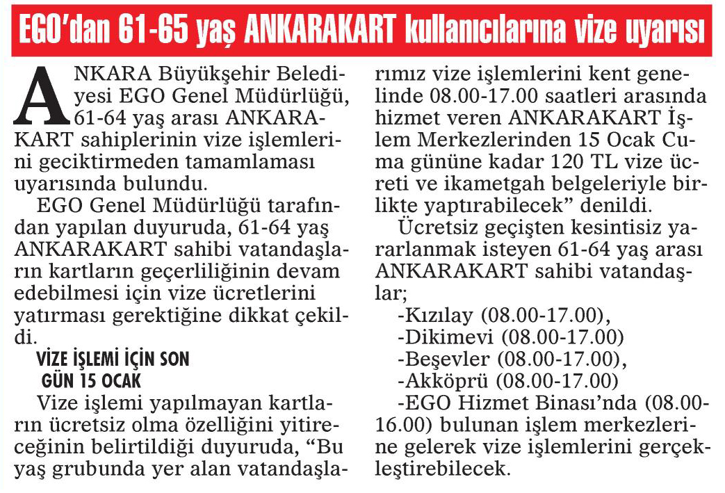 Başkent Postası / 01.02.2021 EGO’dan 61-65 yaş Ankarakart vize uyarısı