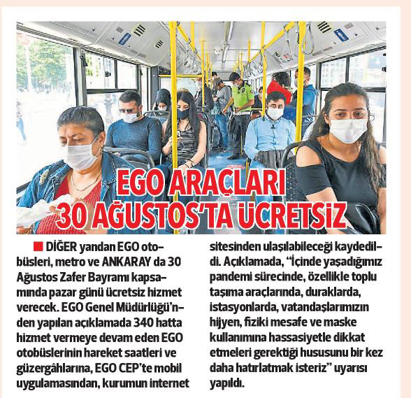Hürriyet Ankara / 27.08.2020 EGO araçları 30 Ağustos’ta ücretsiz