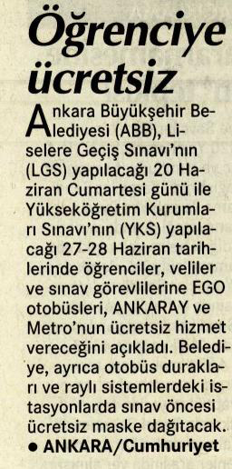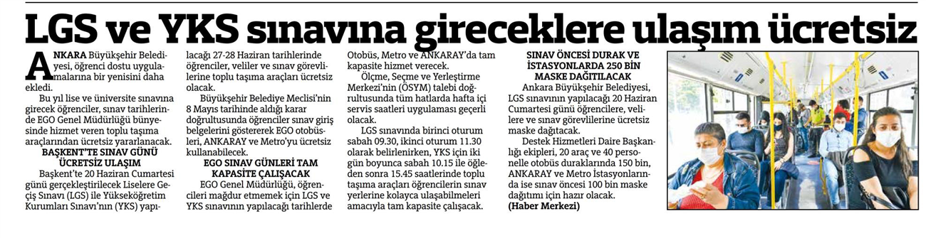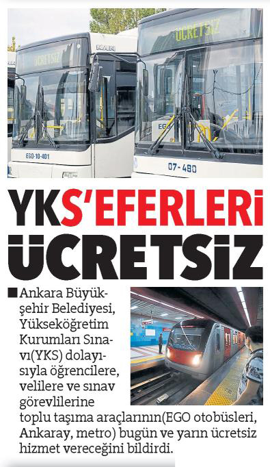 Hürriyet Ankara / 27.06.2020 YKS seferleri ücretsiz