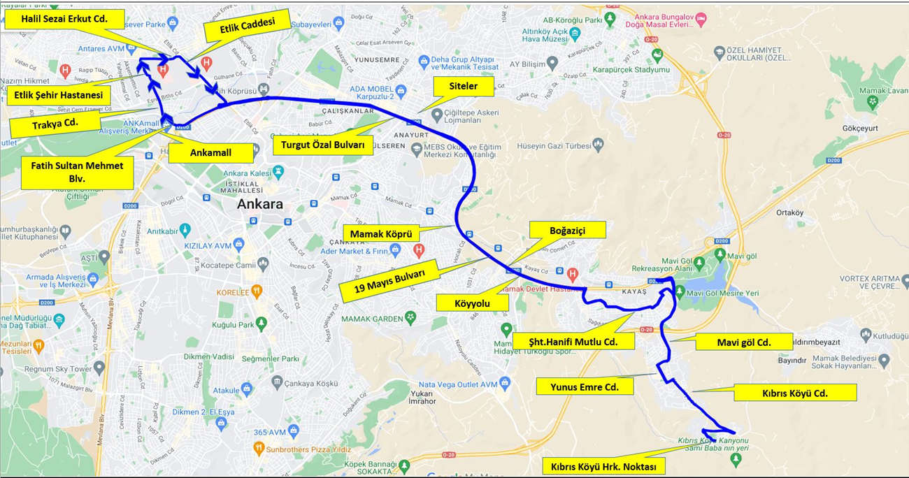 Kıbrıs Köyü Hareket Noktası, Kıbrıs Köyü Caddesi, Nesibe Hatun Caddesi, Veysel Karani Caddesi, Kıbrıs Köyü Caddesi, Hendek Sokak, Yunus Emre Caddesi, 1939.Cadde, Mavi göl Caddesi, 19 Mayıs Bulvarı Mavi göl Kavşaktan U döner, Mavi göl Caddesi,1876.Cadde, 1869.Sokak, 1866.Cadde, Şehit Hanifi Mutlu Caddesi, Şehit Ali İhsan Okatan Sokak, 1768.Cadde, Sağduyu Caddesi, 19 Mayıs Bulvarı, Turgut Özal 2 Bulvarı, Akköprü kavşağı, Fatih Sultan Mehmet Bulvarı, Trakya Caddesi, Etlik Şehir Hastanesi içi, Halil Sezai Erkut Caddesi, Etlik Caddesi, 1011 Kavşağı Etlik Alt geçidinden U döner, Turgut Özal 2 Bulvarı, 19 Mayıs Bulvarı, Sağduyu Caddesi, 1768.Cadde, Şehit Ali İhsan Okatan Sokak, Şehit Hanifi Mutlu Caddesi, 1866.Cadde, 1869.Sokak, 1876.Cadde, Mavi göl Caddesi, 19 Mayıs Bulvarı Mavi göl Kavşaktan U döner, Mavi göl Caddesi, 1939.Cadde, Yunus Emre Caddesi, Hendek Sokak, Kıbrıs Köyü Caddesi, Veysel Karani Caddesi, Nesibe Hatun Caddesi, Kıbrıs Köyü Caddesi, Kıbrıs Köyü Hareket Noktası.