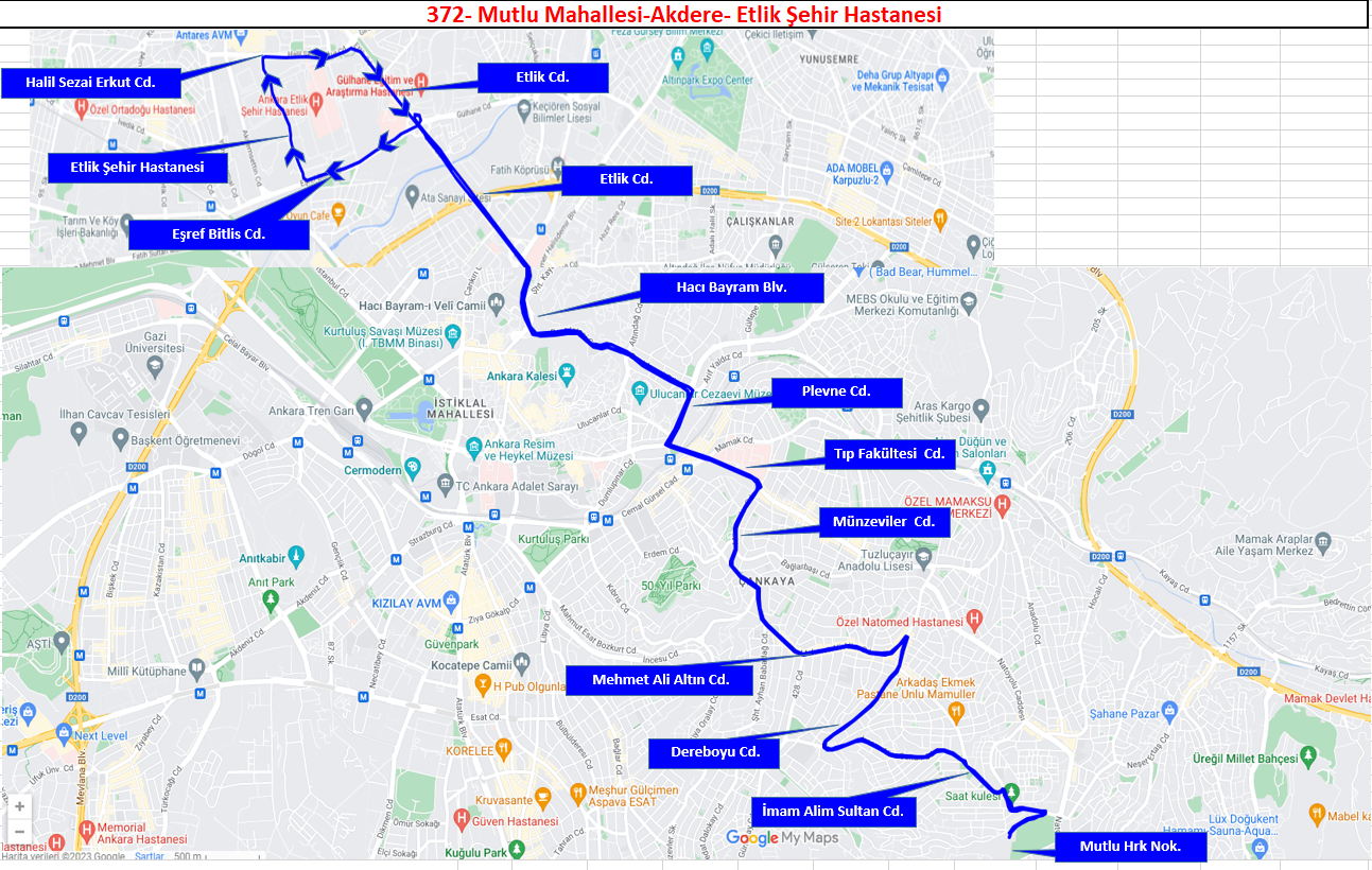 Mutlu Hareket Noktası, 735.Sokak, 723.Sokak, 551.Cadde, İmam Alim Sultan Caddesi, 398. Cadde, Dereboyu Caddesi, Mehmet Ali Altın Caddesi, Münzeviler Caddesi, Tıp Fakültesi Caddesi, Talatpaşa Bulvarı, Plevne Caddesi, Hacı Bayram Bulvarı, Etlik Caddesi, Eşref Bitlis Caddesi, Etlik Şehir Hastanesi içi, Halil Sezai Erkut Cd., Etlik Caddesi, Hacı Bayram Bulvarı, Plevne Caddesi, Talatpaşa Bulvarı, Tıp Fakültesi Caddesi, Münzeviler Caddesi, Mehmet Ali Altın Caddesi, Dereboyu Caddesi, 398. Cadde, İmam Alim Sultan Caddesi, 551.Cadde, 723.Sokak, 735.Sokak, Mutlu Hareket Noktası.