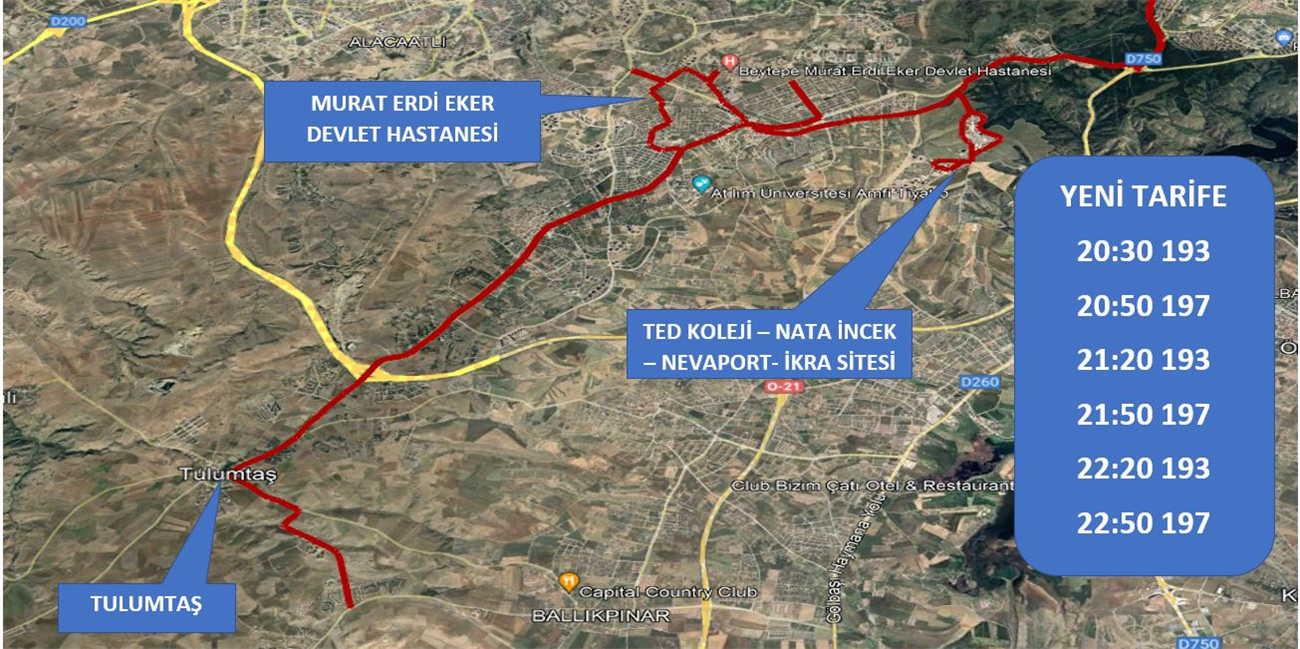 197 HATTINDAN İNCEK TOKİ KONUTLARI ve İNCEK LOFT BÖLGESİ ÇIKARILARAK TED KOLEJİ ve MURAT ERDİ EKER DEVLET HASTANESİNİ KAPSAYACAK ŞEKİLDE HİZMET VERİLMESİ PLANLANMIŞTIR. İNCEK TOKİ KONUTLARI VE İNCEK LOFT BÖLGESİNE 193 HATTININ SERVİS SAATLERİ ARTIRILARAK ULAŞIM HİZMETİ VERİLMEYE DEVAM EDECEKTİR.