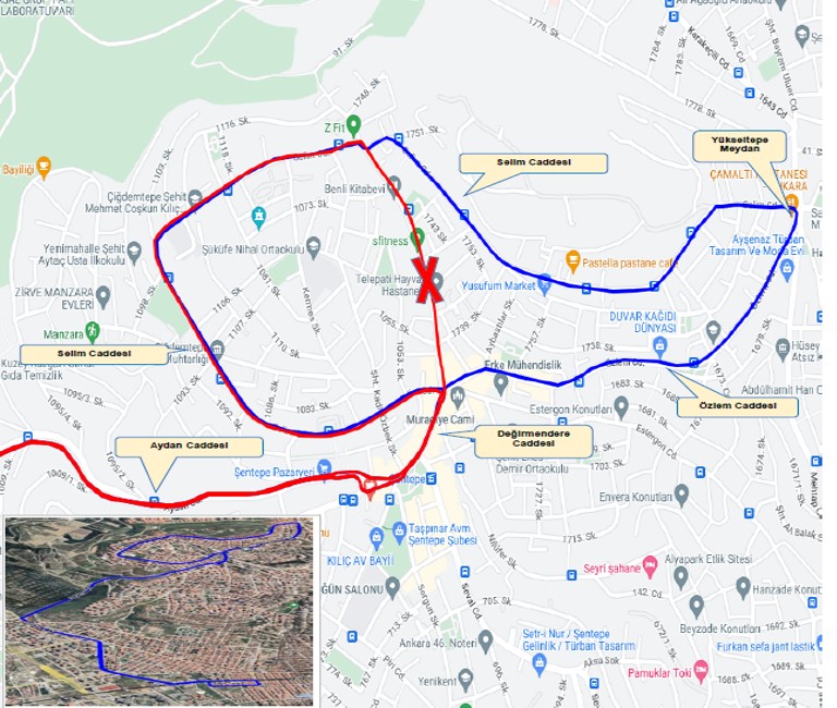 Güzergâh: Hastane Otobüs Hareket Noktasından başlayarak; Vatan Caddesi, Hastane Metro İstasyonu, 357. Cadde, 369. Sokak, Sami Efendi Caddesi, Vatan Caddesi, İvedik Caddesi, Aydan Caddesi, Değirmendere Caddesi, Selim Caddesi, Yükseltepe Meydan, Özlem Caddesi, Değirmendere Caddesi, Aydan Caddesi, İvedik Caddesi, Vatan Caddesi, Hastane Metro İstasyonu