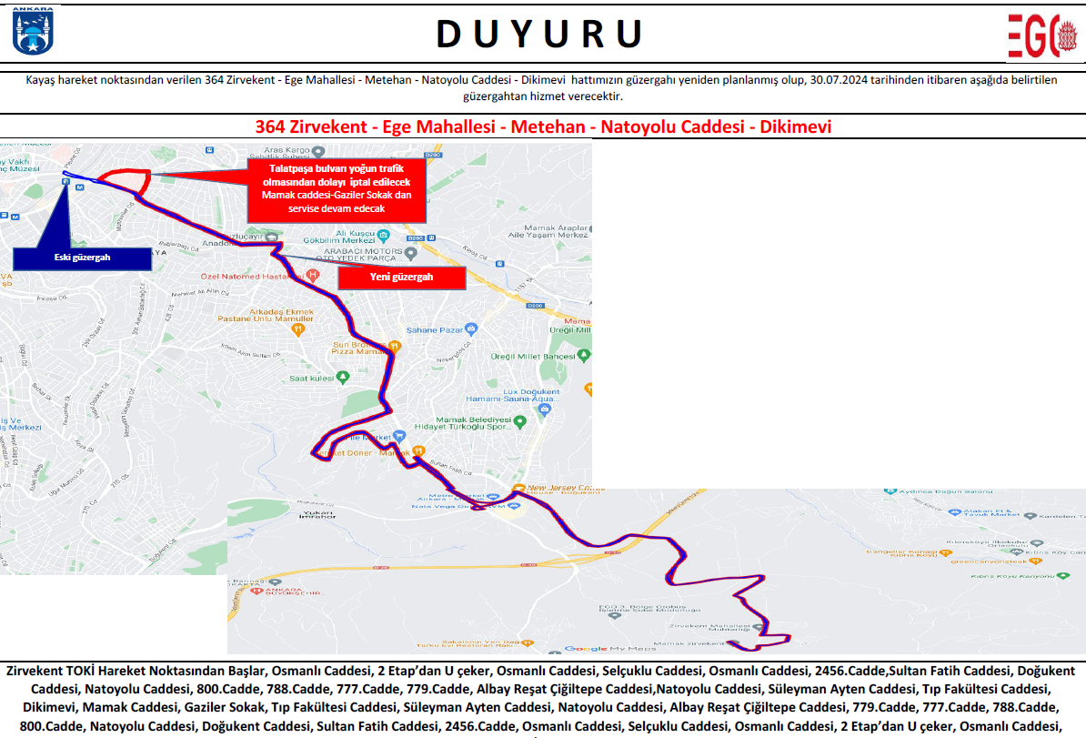 Kayaş hareket noktasından verilen 364 Zirvekent - Ege Mahallesi - Metehan - Natoyolu Caddesi - Dikimevi hattımızın güzergahı yeniden planlanmış olup, 30.07.2024 tarihinden itibaren aşağıda belirtilen güzergahtan hizmet verecektir.
