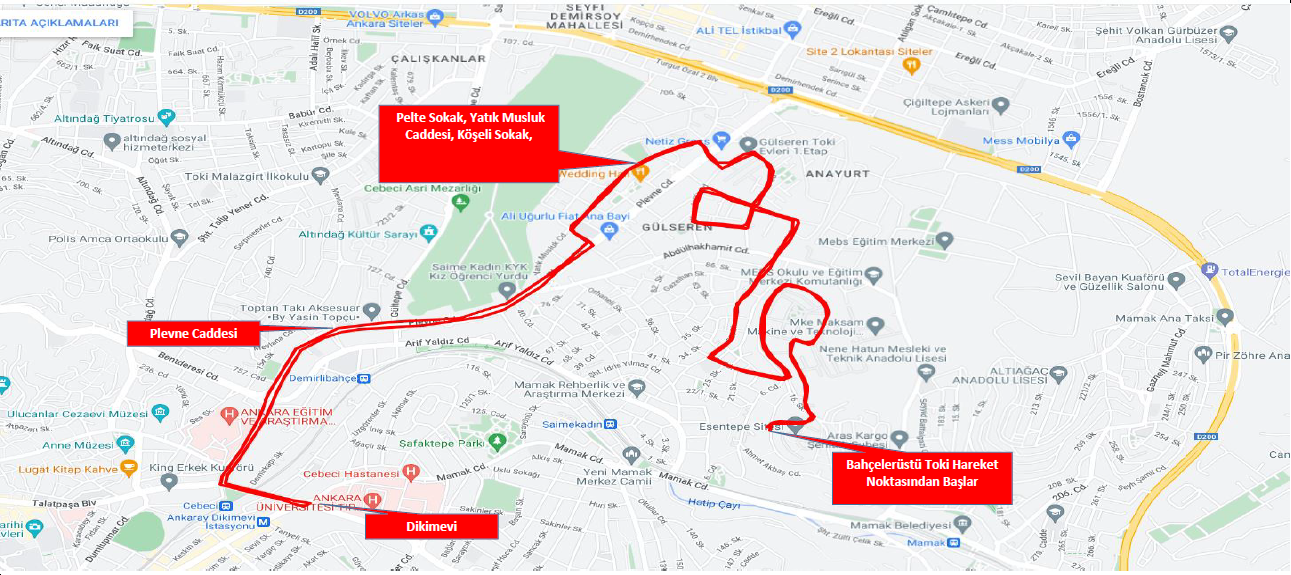 Bahçelerüstü TOKİ Hareket Noktasından Başlar, 14.Sokak, 16.Cadde, 17.Cadde, 59.Cadde, 158.Cadde, 57.Cadde, 16.Cadde, Şehit Umut Coşkun Caddesi, 53. Cadde, Pınarcık Sokak, Elmalı Caddesi, Karamürsel Caddesi, Kırçiçeği Caddesi, Kamelya Caddesi, Kalebent Caddesi, Karadeniz Caddesi, Karamürsel Caddesi, Güldere Caddesi, Karadeniz Caddesi, Dağ gülü Caddesi, Plevne Caddesi, Pelte Sokak, Yatık Musluk Caddesi, Köşeli Sokak, Plevne Caddesi, Talatpaşa Bulvarı, Dikimevi Kavşaktan u döner, Talatpaşa Bulvarı, Plevne Caddesi, Köşeli Sokak, Yatık Musluk Caddesi, Pelte Sokak, Dağ gülü Caddesi, Karadeniz Caddesi, Güldere Caddesi, Karamürsel Caddesi, Karadeniz Caddesi, Kalebent Caddesi, Kamelya Caddesi, Kırçiceği Caddesi, Karamürsel Caddesi, Elmalı Caddesi, Pınarcık Sokak, 53. Cadde, Şehit Umut Coşkun Caddesi, 16.Cadde, 57.Cadde, 158.Cadde, 59.Cadde, 17.Cadde, 16.Cadde, 14.Sokak, Bahçelerüstü TOKİ Hareket Noktası