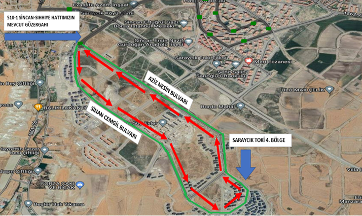 510-1 Sincan Sıhhiye olarak çalışmakta olan hattımızın güzergahı yeniden düzenlenmiş olup, 09.09.2024 tarihinden itibaren aşağıda belirtilen güzergahtan hizmet verecektir.