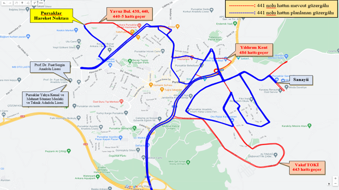 441 “Pursaklar – Belediye Cad. – Karacaören Sanayii – Ulus – Sıhhiye” hattına yönlendirilen araçlarımızın güzergahı, Tevfik İleri Mahallesinde ikamet eden vatandaşlarımızdan gelen talepler doğrultusunda; Prof. Dr. Fuat Sezgin Anadolu Lisesi ile Pursaklar Yahya Kemal ve Mehmet Sönmez Mesleki ve Teknik Adadolu Lisesi öğrencilerinin yararlanacakları şekilde yeniden düzenlenmiş olup, 09.09.2024 Pazartesi günü itibariyle araçlarımız aşağıda belirtilen güzergahta ulaşım hizmeti vermeye devam edecektir