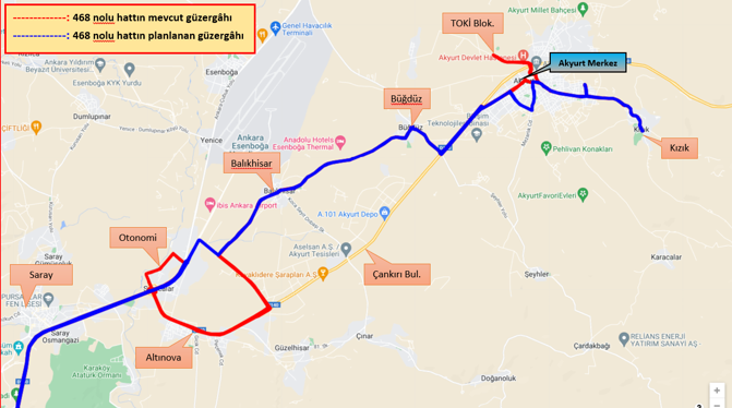 468 Akyurt Kızık Mh. Balıkhisar Büğdüz Altınova Otonomi Sıhhiye olarak çalışmakta olan hattımızın güzergahı yeniden düzenlenmiş olup, 09.09.2024 tarihinden itibaren aşağıda belirtilen güzergahtan hizmet verecektir.