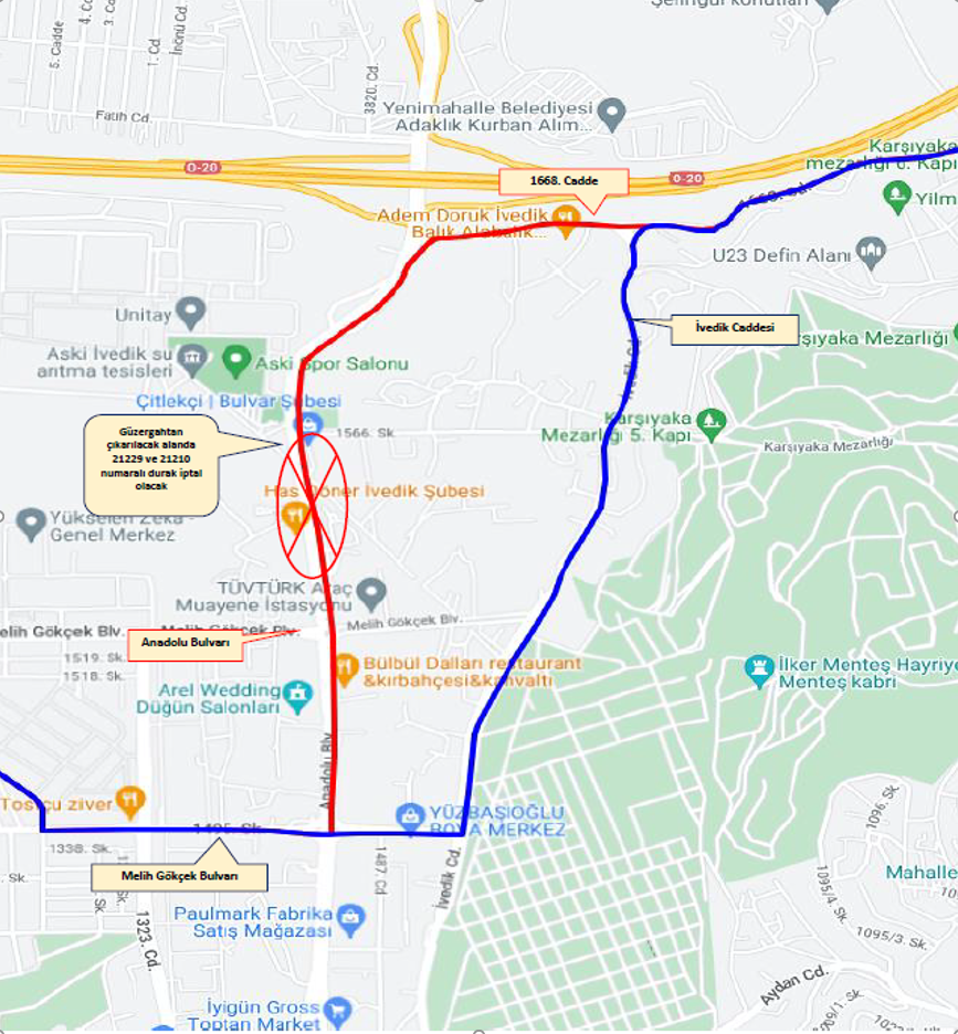 225-2 Ostim-İvedik Osb.-İncirli-Bağlum numaralı hattı kullanan yolcularımızdan, Anadolu Bulvarında mevcut yoğun trafikten dolayı oluşan zaman kaybını önlemek amacı ile gelen güzergahının değiştirilmesi talep ve başvuruları değerlendirilmiş olup; hattın güzergahı Melih Gökçek Bulvarı takiben İvedik Caddesi ‘nden devam edecek şekilde yeniden düzenlemiştir. Uygulamaya 02.10.2024 (Çarşamba) günü başlanılacak olup yolcularımıza önemle duyurulur.