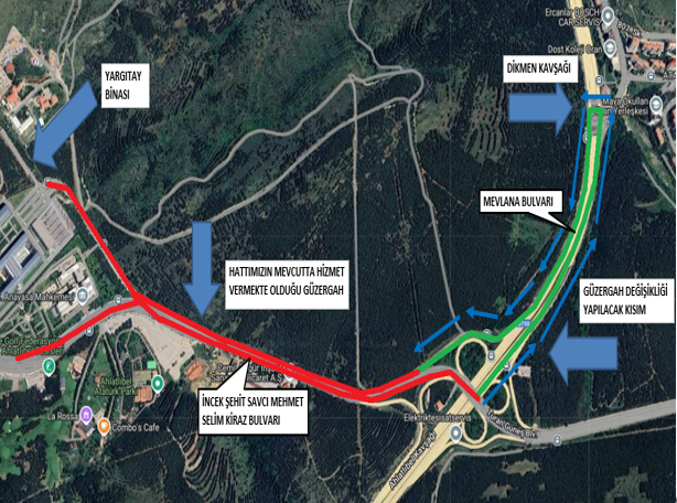 Vatandaşlarımızdan gelen talepler doğrultusunda 607 KORU METRO İSTASYONU-YARGITAY hattımızın güzergahında 07.10.2024 Pazartesi tarihi itibariyle başlanmak üzere krokide belirtilen şekilde düzenlemeye yapılmıştır.
