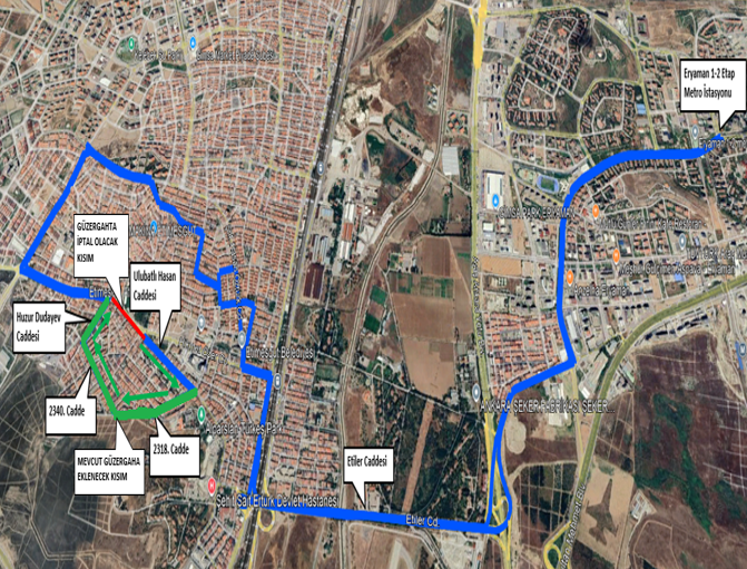 Vatandaşlarımızdan gelen talepler doğrultusunda 553 ETİMESGUT-ERYAMAN 1-2 METRO hattımızın güzergahında 26.10.2024 tarihi itibariiyle başlanmak üzere krokide belirtilen şekilde düzenleme yapılmıştır.