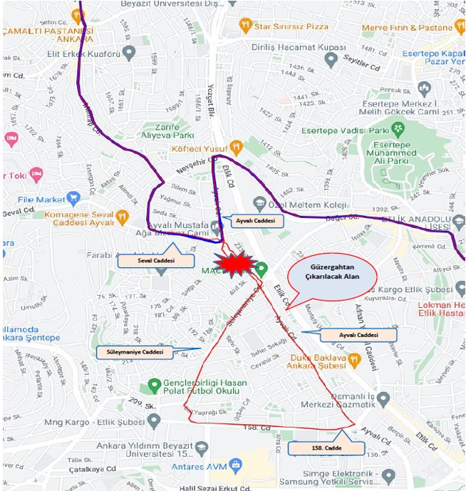 “722-1 Ankara Adliyesi-Yayla Mahallesi” numaralı hattı kullanan yolcularımızdan, Ayvalı Caddesi, Süleymaniye Caddesi ve 158. Cadde üzerinde meydana gelen yoğun trafikten dolayı oluşan zaman kaybını önlemek amacı ile gelen güzergahının değiştirilmesi talep ve başvuruları değerlendirilmiş olup; hattın güzergahı Ayvalı Caddesi takiben Seval Caddesi‘nden devam edecek şekilde yeniden düzenlemiştir. Uygulamaya 30.12.2024 (Pazartesi) günü başlanılacak olup yolcularımıza önemle duyurulur.