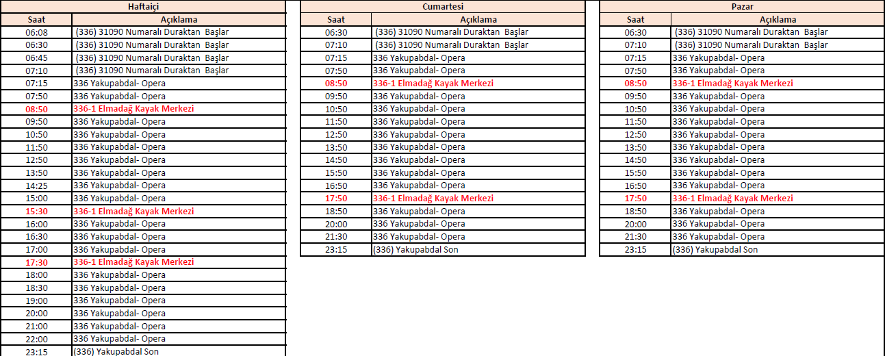 Mevcut güzergahımızdaki EGO Cepte sorunlarının giderilmesi ve vatandaşların memnuniyetlerinin artırılması için, Elmadağ Kayak Merkezi- Karkent Sitesine gidecek yolcularımız için 336-1 Yakupabdal- Opera- Elmadağ Kayak Merkezi- Karkent Sitesi hattı açılmış olup, 07.03.2025 tarihinden itibaren aşağıda belirtilen güzergah ve servis saatleri ile hizmet verilecektir. Kuruluşumuzun resmi internet sitesi ve EGO CEPTE mobil uygulaması üzerinden güncel olarak ulaşabilirsiniz.Not: 336 Yakupabdal- Opera hattımızın güzergahı ve servis saatleri ile ilgili herhangi bir değişiklik yapılmamıştır.