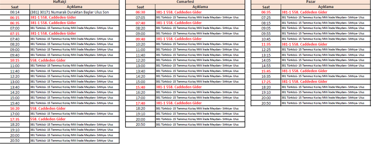 .Mevcut güzergahımızdaki EGO Cepte sorunlarının giderilmesi ve vatandaşların memnuniyetlerinin artırılması için, 558. Caddeye gidecek yolcularımız için 381-1 Türközü- 558.Cadde- 15 Temmuz Kızılay Milli İrade Meydanı- Sıhhiye- Ulus hattı açılmış olup, 07.03.2025 tarihinden itibaren aşağıda belirtilen güzergah ve servis saatleri ile hizmet verilecektir. Kuruluşumuzun resmi internet sitesi ve EGO CEPTE mobil uygulaması üzerinden güncel olarak ulaşabilirsiniz.Not: 381 Türközü- 15 Temmuz Kızılay Milli İrade Meydanı- Sıhhiye- Ulus hattımızın güzergahı ve servis saatleri ile ilgili herhangi bir değişiklik yapılmamıştır.